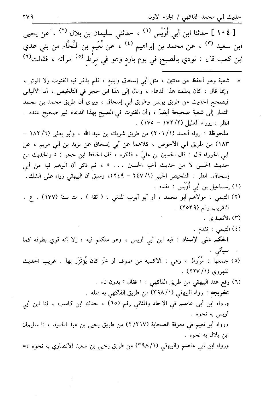 104 - حَدَّثَنَا ابْنُ أَبِي أُوَيْسٍ، حَدَّثَنِي سُلَيْمَانُ بْنُ بِلَالٍ، عَنْ يَحْيَى بْنِ سَعِيدٍ، عَنْ مُحَمَّدِ بْنِ إِبْرَاهِيمَ، عَنْ نُعَيْمِ بْنِ النَّحَّامِ، مِنْ بَنِي عَدِيِّ بْنِ كَعْبٍ قَالَ: " §نُودِيَ بِالصُّبْحِ فِي يَوْمٍ بَارِدٍ وَهُوَ فِي مِرْطِ امْرَأَتِهِ، فَقَالَتْ: -[280]- لَيْتَ الْمُنَادِي يُنَادِي، وَمَنْ قَعَدَ فَلَا حَرَجَ، فَنَادَى الْمُنَادِي فِي آخِرِ أَذَانِهِ: وَمَنْ قَعَدَ فَلَا حَرَجَ، وَذَلِكَ فِي زَمَنِ النَّبِيِّ صَلَّى اللهُ عَلَيْهِ وَسَلَّمَ "
