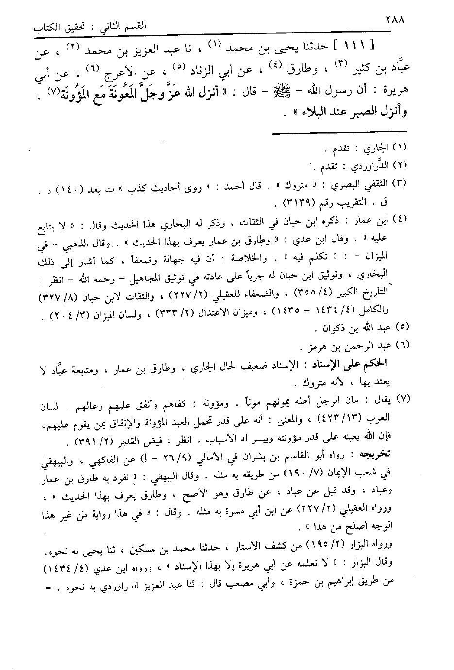 111 - حَدَّثَنَا يَحْيَى بْنُ مُحَمَّدٍ، نا عَبْدُ الْعَزِيزِ بْنُ مُحَمَّدٍ، عَنْ عَبَّادِ بْنِ كَثِيرٍ، وَطَارِقٍ، عَنْ أَبِي الزِّنَادِ، عَنِ الْأَعْرَجِ، عَنْ أَبِي هُرَيْرَةَ، أَنَّ رَسُولَ اللَّهِ صَلَّى اللهُ عَلَيْهِ وَسَلَّمَ قَالَ: «§أَنْزَلَ اللَّهُ عَزَّ وَجَلَّ الْمَعُونَةَ مَعَ الْمَؤُونَةِ، وَأَنْزَلَ الصَّبْرَ عِنْدَ الْبَلَاءِ»