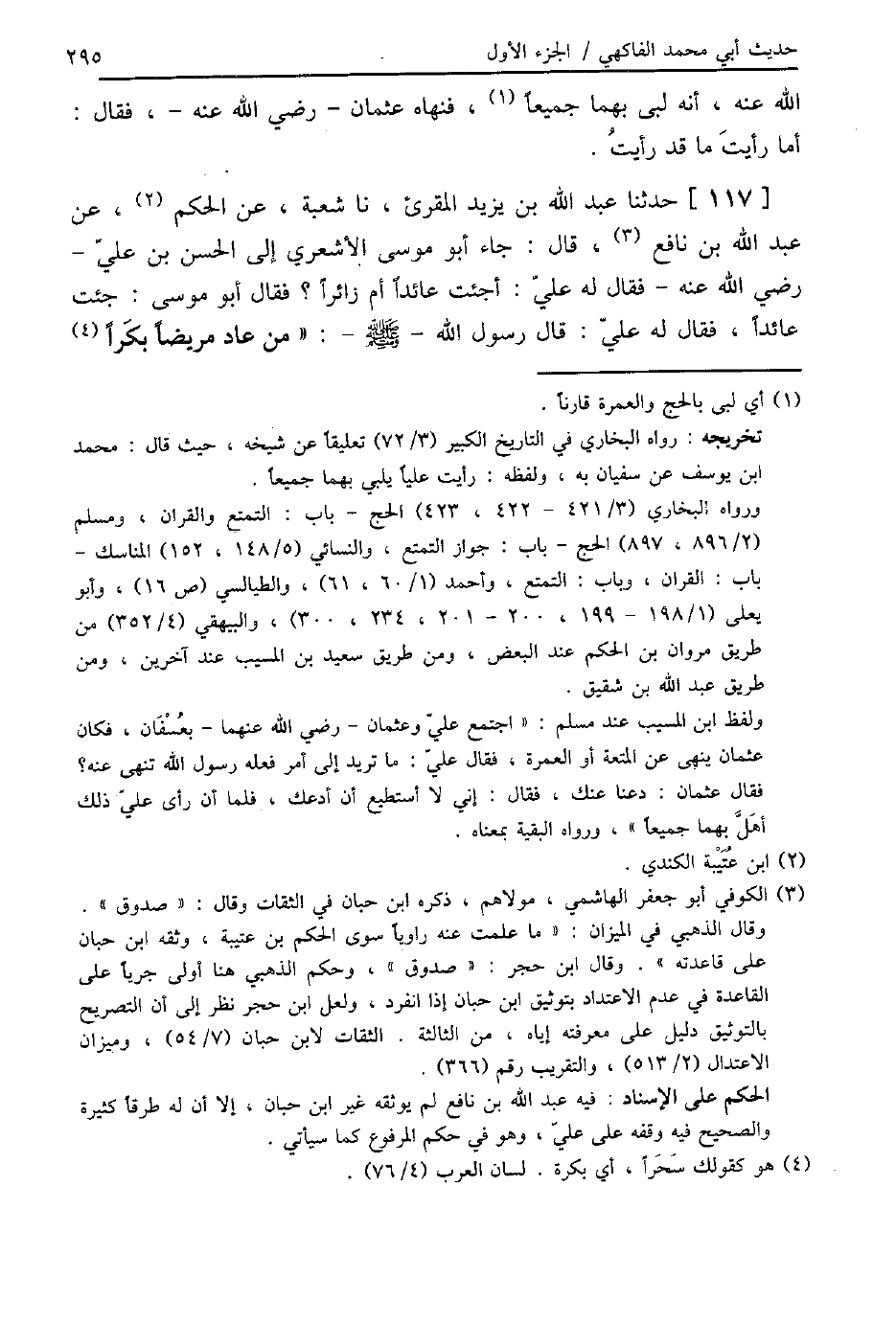 117 - حَدَّثَنَا عَبْدُ اللَّهِ بْنُ يَزِيدَ الْمُقْرِئُ، نا شُعْبَةُ، عَنِ الْحَكَمِ، عَنْ عَبْدِ اللَّهِ بْنِ نَافِعٍ، قَالَ: جَاءَ أَبُو مُوسَى الْأَشْعَرِيُّ إِلَى الْحَسَنِ بْنِ عَلِيٍّ رَضِيَ اللَّهُ عَنْهُ فَقَالَ لَهُ عَلِيٌّ: أَجِئْتَ عَائِدًا أَوْ زَائِرًا؟ فَقَالَ أَبُو مُوسَى: جِئْتُ عَائِدًا، فَقَالَ لَهُ عَلِيٌّ: قَالَ رَسُولُ اللَّهِ صَلَّى اللهُ عَلَيْهِ وَسَلَّمَ: «§مَنْ عَادَ مَرِيضًا بَكَرًا -[296]- شَيَّعَهُ سَبْعُونَ أَلْفَ مَلَكٍ كُلُّهُمْ يَسْتَغْفِرُ لَهُ حَتَّى يُمْسِيَ، وَكَانَ لَهُ خَرِيفٌ فِي الْجَنَّةِ، وَإِنْ عَادَ مَسَاءٍ شَيَّعَهُ سَبْعُونَ أَلْفَ مَلَكٍ كُلُّهُمْ يَسْتَغْفِرُ لَهُ حَتَّى يُصْبِحَ، وَكَانَ لَهُ خَرِيفٌ فِي الْجَنَّةِ» قَالَ ابْنُ يَحْيَى: ثُمَّ وَقَفَهُ الْمُقْرِئُ بَعْدَ ذَلِكَ عَنْ عَلِيٍّ، وَلَمْ يَذْكُرِ النَّبِيَّ صَلَّى اللهُ عَلَيْهِ وَسَلَّمَ، وَقَالَ: بَلَغَنِي أَنَّ عَبْدَ الْمَلِكِ الْجُدِّيَّ يَقِفُهُ وَهُوَ أَحْفَظُ مِنِّي
