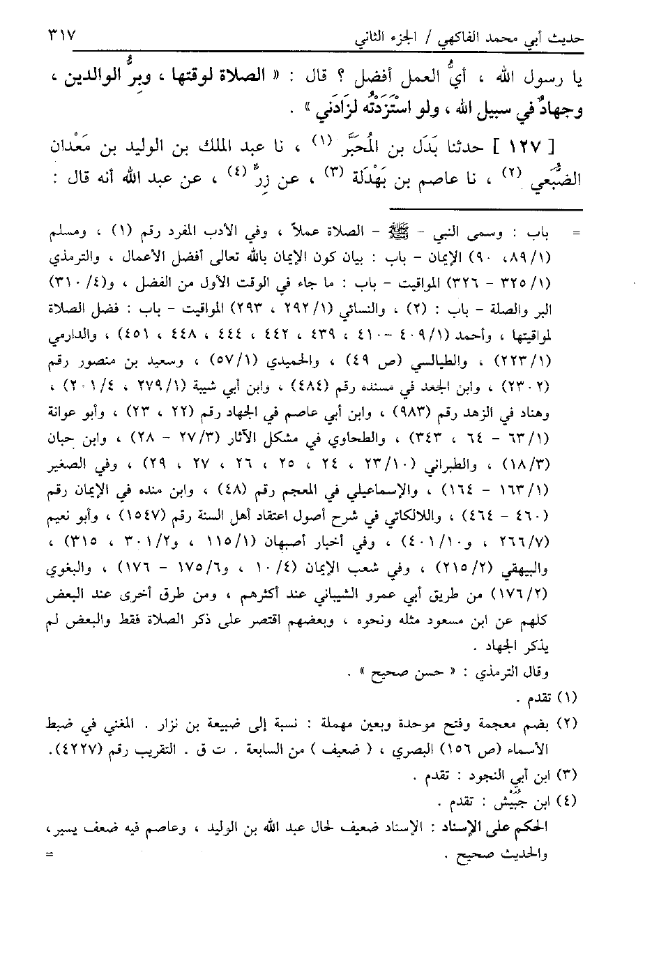 127 - حَدَّثَنَا بَدَلُ بْنُ الْمُحَبَّرِ، نا عَبْدُ الْمَلِكِ بْنُ الْوَلِيدِ بْنِ مَعْدَانَ الضُّبَعِيُّ، نا عَاصِمُ ابْنُ بَهْدَلَةَ، عَنْ زِرٍّ، عَنْ عَبْدِ اللَّهِ، أَنَّهُ قَالَ: -[318]- «§كَأَنِّي أَنْظُرُ إِلَى بَيَاضٍ خَدَّيْ رَسُولِ اللَّهِ صَلَّى اللهُ عَلَيْهِ وَسَلَّمَ وَهُوَ يُسَلِّمُ عَنْ يَمِينِهِ وَعَنْ يَسَارِهِ»