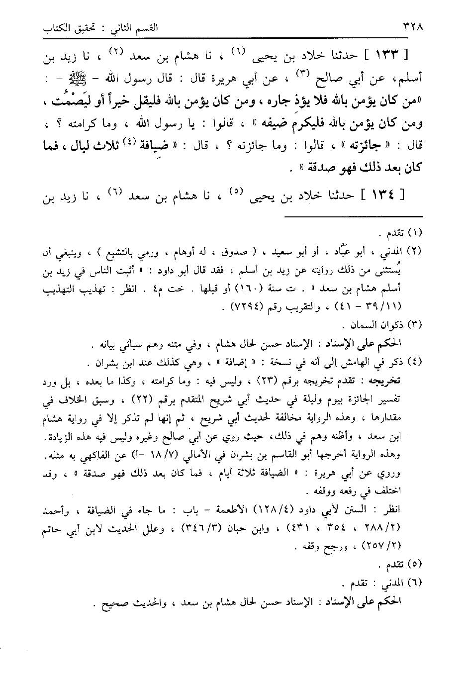 133 - حَدَّثَنَا خَلَّادُ بْنُ يَحْيَى، نا هِشَامُ بْنُ سَعْدٍ، نا زَيْدُ بْنُ أَسْلَمَ، عَنْ أَبِي صَالِحٍ، عَنْ أَبِي هُرَيْرَةَ، قَالَ: قَالَ رَسُولُ اللَّهِ صَلَّى اللهُ عَلَيْهِ وَسَلَّمَ: «§مَنْ كَانَ يُؤْمِنُ بِاللَّهِ فَلَا يُؤْذِ جَارَهُ، وَمَنْ كَانَ يُؤْمِنُ بِاللَّهِ فَلْيَقُلْ خَيْرًا أَوْ لِيَصْمُتْ، وَمَنْ كَانَ يُؤْمِنُ بِاللَّهِ فَلْيُكْرِمْ ضَيْفَهُ» ، قَالُوا: يَا رَسُولَ اللَّهِ، وَمَا كَرَامَتُهُ؟، قَالَ: «جَائِزَتُهُ» ، قَالُوا: وَمَا جَائِزَتُهُ؟، قَالَ: «ضِيَافَةُ ثَلَاثَ لَيَالٍ، فَمَا كَانَ بَعْدَ ذَلِكَ فَهُوَ صَدَقَةٌ»