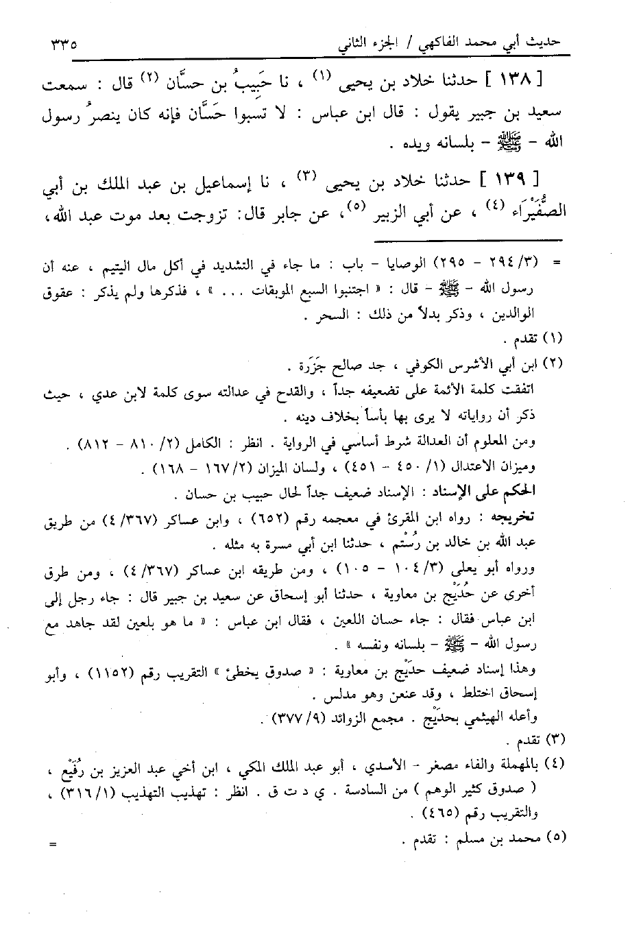 138 - حَدَّثَنَا خَلَّادُ بْنُ يَحْيَى، نا حَبِيبُ بْنُ حَسَّانَ، قَالَ: سَمِعْتُ سَعِيدَ بْنَ جُبَيْرٍ، يَقُولُ: قَالَ ابْنُ عَبَّاسٍ: «§لَا تَسُبُّوا حَسَّانَ فَإِنَّهُ كَانَ يَنْصُرُ رَسُولَ اللَّهِ صَلَّى اللهُ عَلَيْهِ وَسَلَّمَ بِلِسَانِهِ وَيَدِهِ»
