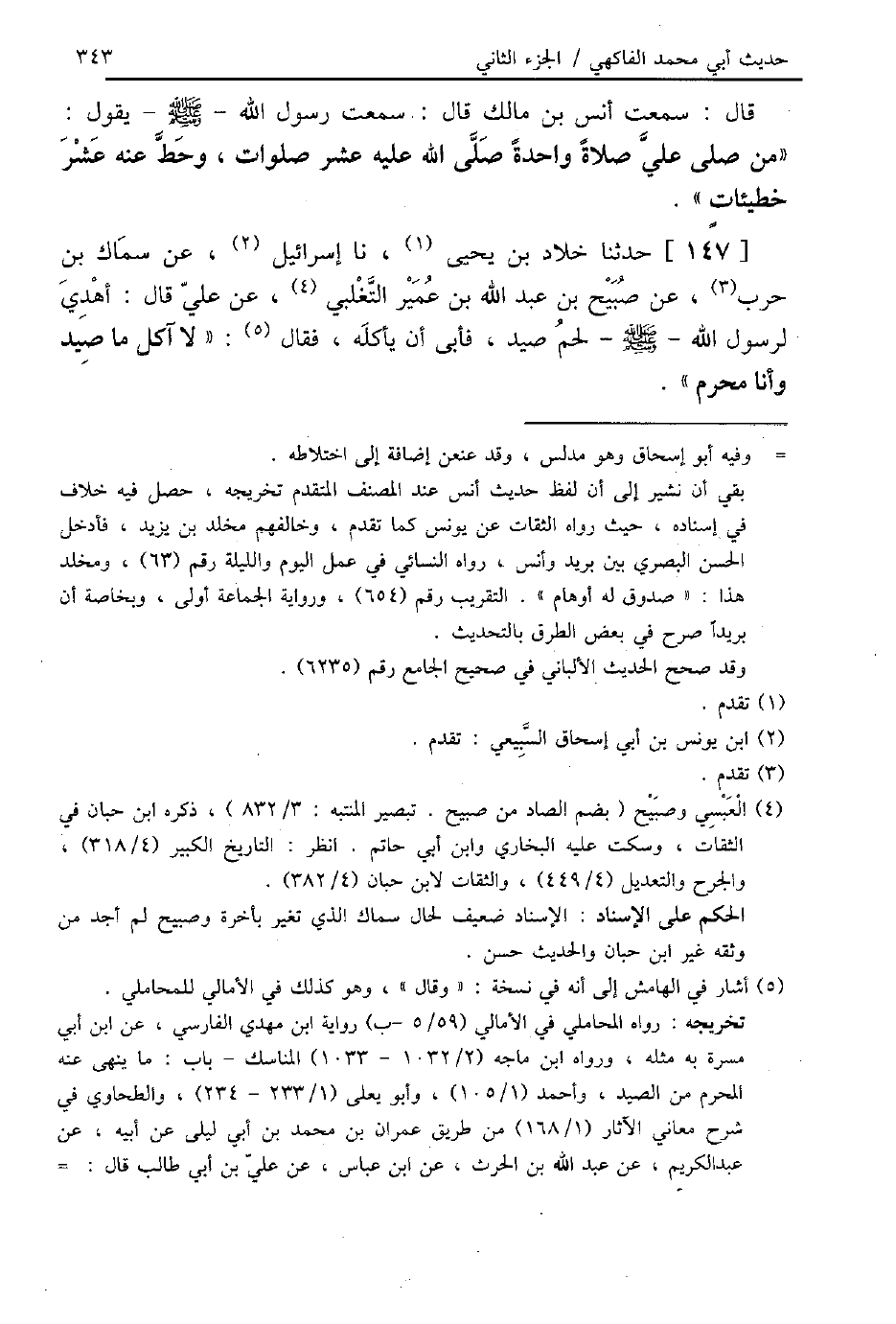 147 - حَدَّثَنَا خَلَّادُ بْنُ يَحْيَى، نا إِسْرَائِيلُ، عَنْ سِمَاكِ بْنِ حَرْبٍ، عَنْ صُبَيْحِ بْنِ عَبْدِ اللَّهِ بْنِ عُمَيْرٍ التَّغْلِبِيِّ، عَنْ عَلِيٍّ، قَالَ: أُهْدِيَ لِرَسُولِ اللَّهِ صَلَّى اللهُ عَلَيْهِ وَسَلَّمَ لَحْمُ صَيْدٍ، فَأَبَى أَنْ يَأْكُلَهُ، فَقَالَ: «§لَا آكُلُ مَا صِيدَ وَأَنَا مُحْرِمٌ»