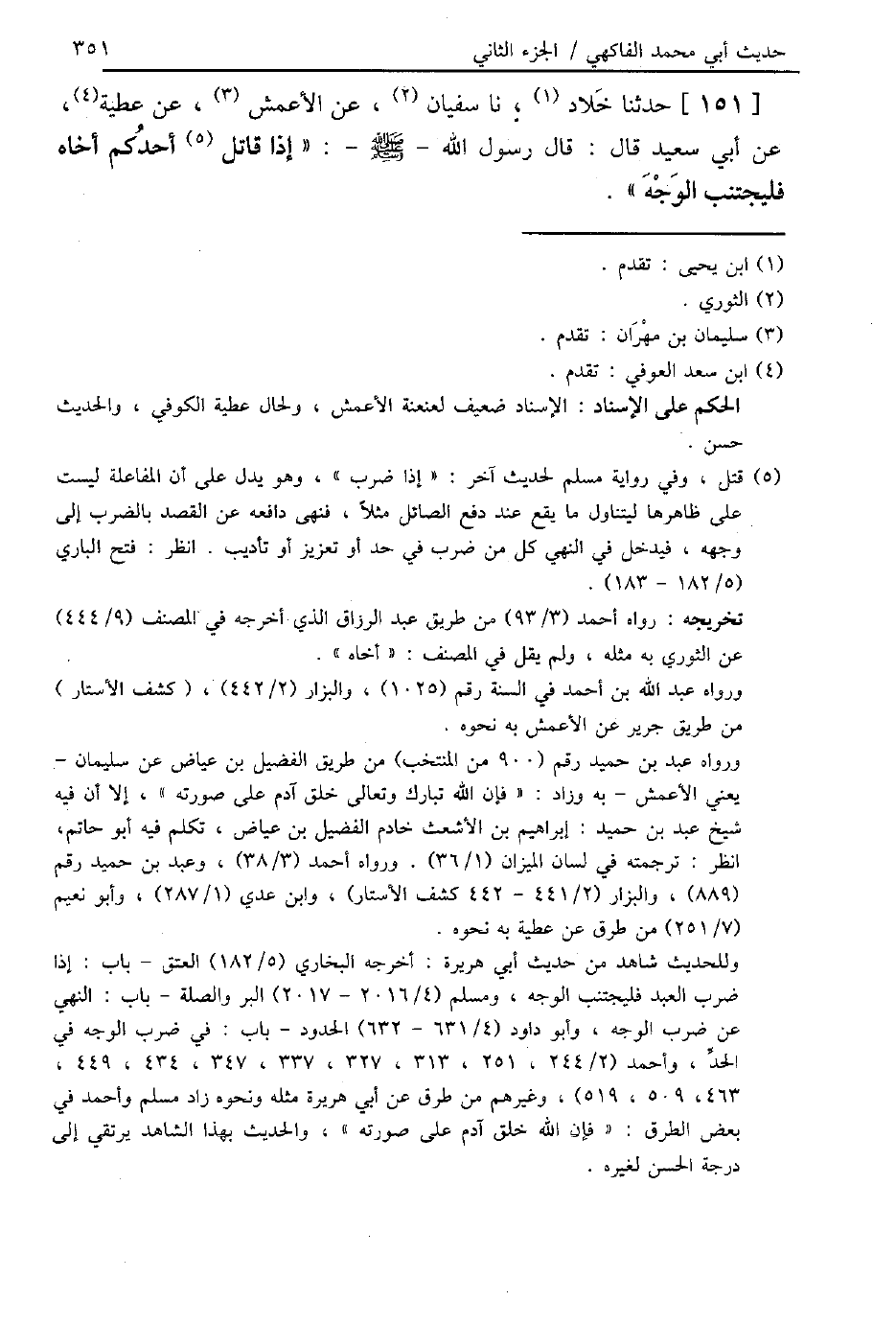 151 - حَدَّثَنَا خَلَّادٌ، نا سُفْيَانُ، عَنِ الْأَعْمَشِ، عَنْ عَطِيَّةَ، عَنْ أَبِي سَعِيدٍ، قَالَ: قَالَ رَسُولُ اللَّهِ صَلَّى اللهُ عَلَيْهِ وَسَلَّمَ: «§إِذَا قَاتَلَ أَحَدُكُمْ أَخَاهُ فَلْيَجْتَنِبِ الْوَجْهَ»