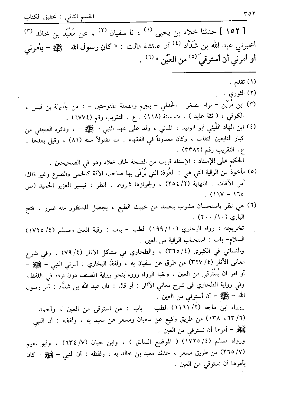 152 - حَدَّثَنَا خَلَّادُ بْنُ يَحْيَى، نا سُفْيَانُ، عَنْ مَعْبَدِ بْنِ خَالِدٍ، أَخْبَرَنِي عَبْدُ اللَّهِ بْنُ شَدَّادٍ، أَنَّ عَائِشَةَ، قَالَتْ: «كَانَ رَسُولُ اللَّهِ صَلَّى اللهُ عَلَيْهِ وَسَلَّمَ §يَأْمُرُنِي أَوْ أَمَرَنِي أَنْ أَسْتَرْقِيَ مِنَ الْعَيْنِ»