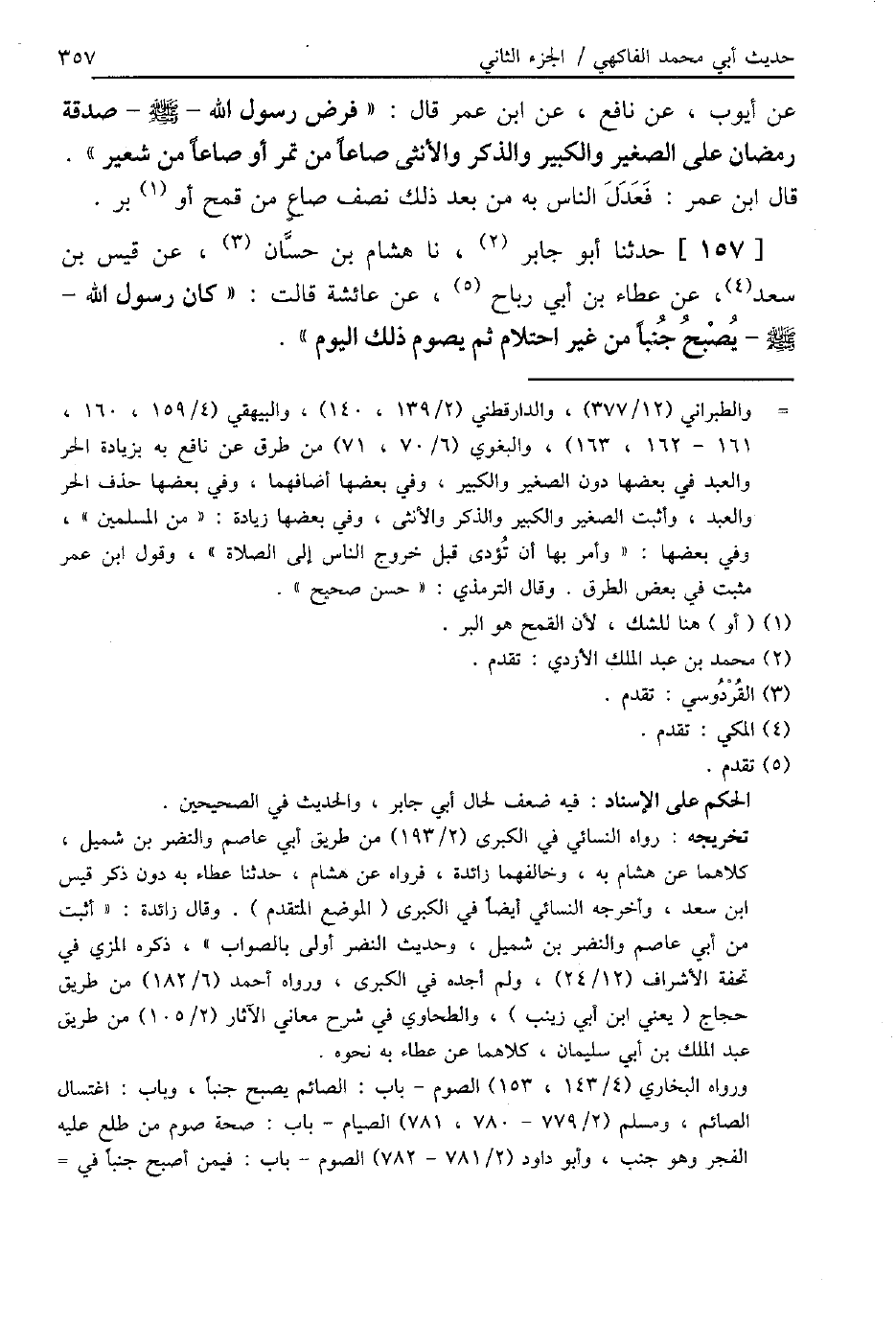157 - حَدَّثَنَا أَبُو جَابِرٍ، نا هِشَامُ بْنُ حَسَّانَ، عَنْ قَيْسِ بْنِ سَعْدٍ، عَنْ عَطَاءِ بْنِ أَبِي رَبَاحٍ، عَنْ عَائِشَةَ، قَالَتْ: «كَانَ رَسُولُ اللَّهِ صَلَّى اللهُ عَلَيْهِ وَسَلَّمَ §يُصْبِحُ جُنُبًا مِنْ غَيْرِ احْتِلَامٍ ثُمَّ يَصُومُ ذَلِكَ الْيَوْمَ»