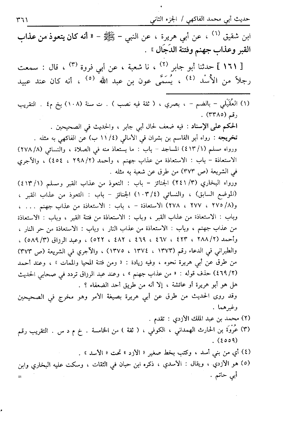 161 - حَدَّثَنَا أَبُو جَابِرٍ، نا شُعْبَةُ، عَنْ أَبِي فَرْوَةَ، قَالَ: سَمِعْتُ رَجُلًا مِنَ الْأُسْدِ يُسَمَّى عَوْنَ بْنَ عَبْدِ اللَّهِ، أَنَّهُ كَانَ عِنْدَ عُبَيْدِ -[362]- بْنِ مَعْمَرٍ، وَأَنَّهُ كَتَبَ إِلَى ابْنِ عُمَرَ يَسْأَلُهُ عَنِ الصَّلَاةِ بِفَارِسَ، فَقَالَ: «كَانَ النَّبِيُّ صَلَّى اللهُ عَلَيْهِ وَسَلَّمَ §إِذَا خَرَجَ مِنْ أَهْلِهِ لَمْ يُصَلِّ إِلَّا رَكْعَتَيْنِ حَتَّى يَرْجِعَ إِلَيْهِمْ»