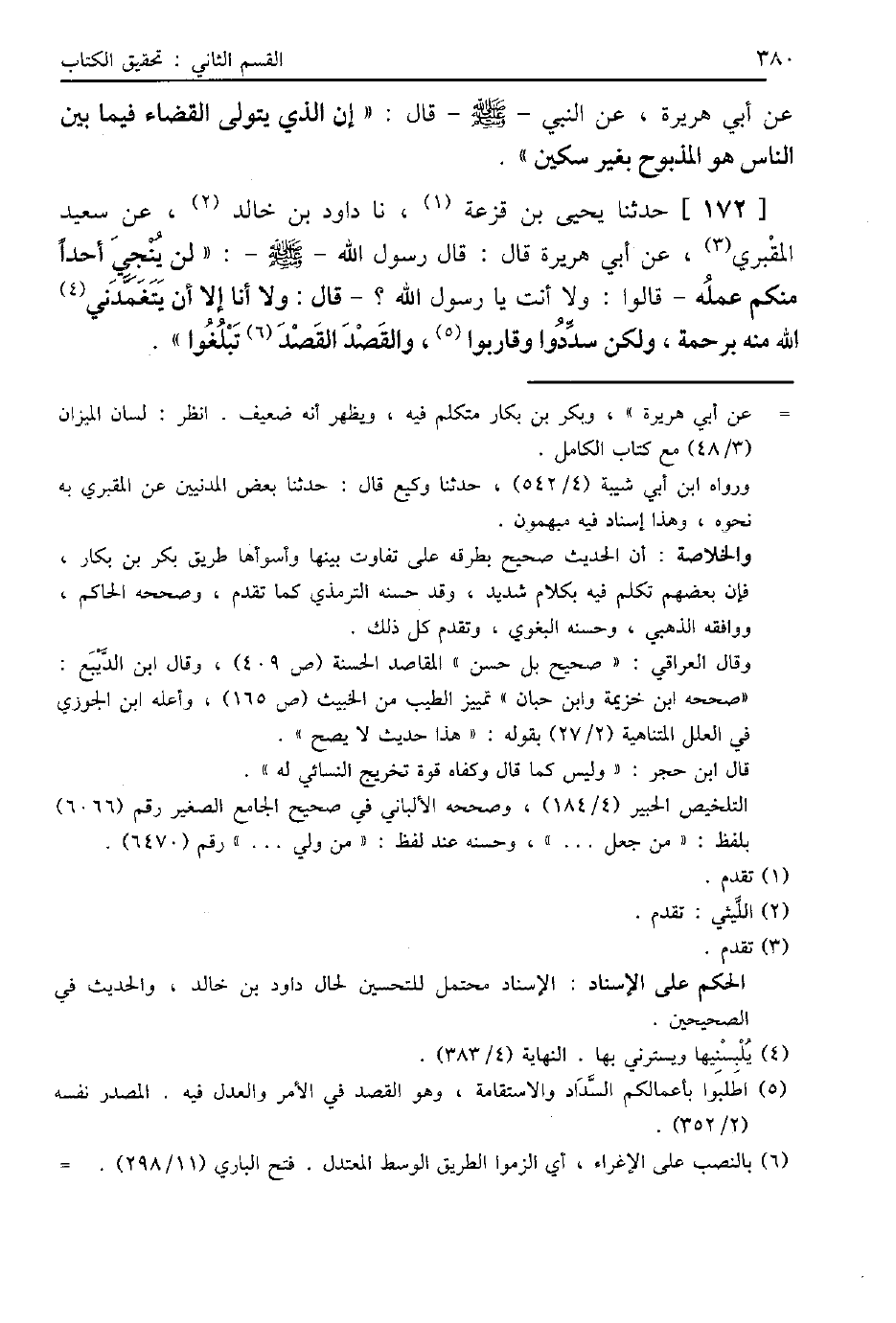 172 - حَدَّثَنَا يَحْيَى بْنُ قَزَعَةَ، نا دَاوُدُ بْنُ خَالِدٍ، عَنْ سَعِيدٍ الْمَقْبُرِيِّ، عَنْ أَبِي هُرَيْرَةَ، قَالَ: قَالَ رَسُولُ اللَّهِ صَلَّى اللهُ عَلَيْهِ وَسَلَّمَ: «§لَنْ يُنْجِيَ أَحَدًا مِنْكُمْ عَمَلُهُ» قَالُوا: وَلَا أَنْتَ يَا رَسُولَ اللَّهِ؟ قَالَ: «وَلَا أَنَا إِلَّا أَنْ يَتَغَمَّدَنِي اللَّهُ مِنْهُ بِرَحْمَةَ، وَلَكِنْ سَدِّدُوا وَقَارِبُوا، وَالْقَصْدَ الْقَصْدَ تَبْلُغُوا»
