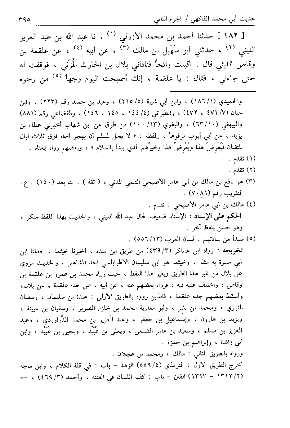 182 - حَدَّثَنَا أَحْمَدُ بْنُ مُحَمَّدٍ الْأَزْرَقِيُّ، نا عَبْدُ اللَّهِ بْنُ عَبْدِ الْعَزِيزِ اللَّيْثِيُّ، حَدَّثَنِي أَبُو سُهَيْلِ بْنُ مَالِكٍ، عَنْ أَبِيهِ، عَنْ عَلْقَمَةَ بْنِ وَقَّاصٍ اللَّيْثِيِّ، قَالَ: أَقْبَلْتُ رَائِحًا فَنَادَانِي بِلَالُ بْنُ الْحَارِثِ الْمُزَنِيُّ، فَوَقَفْتُ لَهُ حَتَّى جَاءَنِي، فَقَالَ: يَا عَلْقَمَةُ، إِنَّكَ أَصْبَحْتَ الْيَوْمَ وَجْهًا مِنْ وُجُوهِ -[397]- الْمُهَاجِرِينَ، وَإِنَّكَ تَدْخُلُ عَلَى هَذَا الْإِنْسَانِ - يَعْنِي مَرْوَانَ - وَإِنِّي سَمِعْتُ النَّبِيَّ صَلَّى اللهُ عَلَيْهِ وَسَلَّمَ يَقُولُ: «§يَكُونُ بَعْدِي أُمَرَاءُ، فَمَنْ دَخَلَ عَلَيْهِمْ فَلْيَقُلْ حَقًّا، وَإِنَّ أَحَدَكُمْ لَيَتَكَلَّمُ بِالْكَلِمَةِ يُرْضِي بِهَا السُّلْطَانَ فَيَهْوِي بِهَا أَبْعَدَ مِنَ السَّمَاءِ»