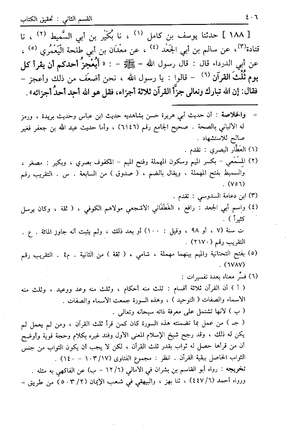 188 - حَدَّثَنَا يُوسُفُ بْنُ كَامِلٍ، نا بُكَيْرُ بْنُ أَبِي السُّمَيْطِ، نا قَتَادَةُ، عَنْ سَالِمِ بْنِ أَبِي الْجَعْدِ، عَنْ مَعْدَانَ بْنِ أَبِي طَلْحَةَ الْيَعْمَرِيِّ، عَنْ أَبِي الدَّرْدَاءِ، قَالَ: قَالَ رَسُولُ اللَّهِ صَلَّى اللهُ عَلَيْهِ وَسَلَّمَ: «§أَيَعْجِزُ أَحَدُكُمْ أَنْ يَقْرَأَ كُلَّ يَوْمٍ ثُلُثَ الْقُرْآنِ» قَالُوا: يَا رَسُولَ اللَّهِ، نَحْنُ أَضْعَفُ مِنْ ذَلِكَ وَأَعْجَزُ فَقَالَ: «إِنَّ اللَّهَ تَبَارَكَ وَتَعَالَى جَزَّأَ الْقُرْآنَ ثَلَاثَةَ أَجْزَاءٍ، فَقُلْ هُوَ اللَّهُ أَحَدٌ أَحَدُ أَجْزَائِهِ»