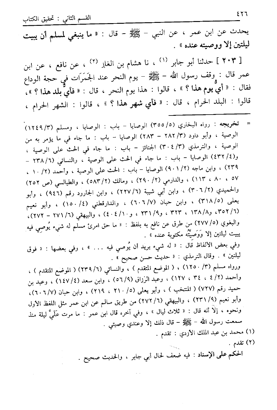 203 - حَدَّثَنَا أَبُو جَابِرٍ، نا هِشَامُ بْنُ الْغَازِ، عَنْ نَافِعٍ، عَنِ ابْنِ عُمَرَ، قَالَ: وَقَفَ رَسُولُ اللَّهِ صَلَّى اللهُ عَلَيْهِ وَسَلَّمَ يَوْمَ النَّحْرِ عِنْدَ الْجَمَرَاتِ فِي حَجَّةِ الْوَدَاعِ فَقَالَ: «أَيُّ يَوْمٍ هَذَا؟» ، قَالُوا: هَذَا يَوْمُ النَّحْرِ، قَالَ: «فَأَيُّ بَلَدٍ هَذَا؟» ، قَالُوا: الْبَلَدُ الْحَرَامُ، قَالَ: «فَأَيُّ شَهْرٍ هَذَا؟» ، قَالُوا: الشَّهْرُ الْحَرَامُ، -[427]- قَالَ: «هَذَا يَوْمُ الْحَجِّ الْأَكْبَرِ، §فَدِمَاؤُكُمْ وَأَمْوَالُكُمْ وَأَعْرَاضُكُمْ عَلَيْكُمْ حَرَامٌ كَحُرْمَةِ هَذَا الْبَلَدِ فِي هَذَا الْيَوْمِ» ، ثُمَّ قَالَ: «هَلْ بَلَّغْتُ؟» ، قَالُوا: نَعَمْ، وَطَفِقَ رَسُولُ اللَّهِ صَلَّى اللهُ عَلَيْهِ وَسَلَّمَ يَقُولُ: «اللَّهُمَّ اشْهَدْ» ، ثُمَّ وَدَّعَ النَّاسَ، فَقَالُوا: هَذِهِ حَجَّةُ الْوَدَاعِ