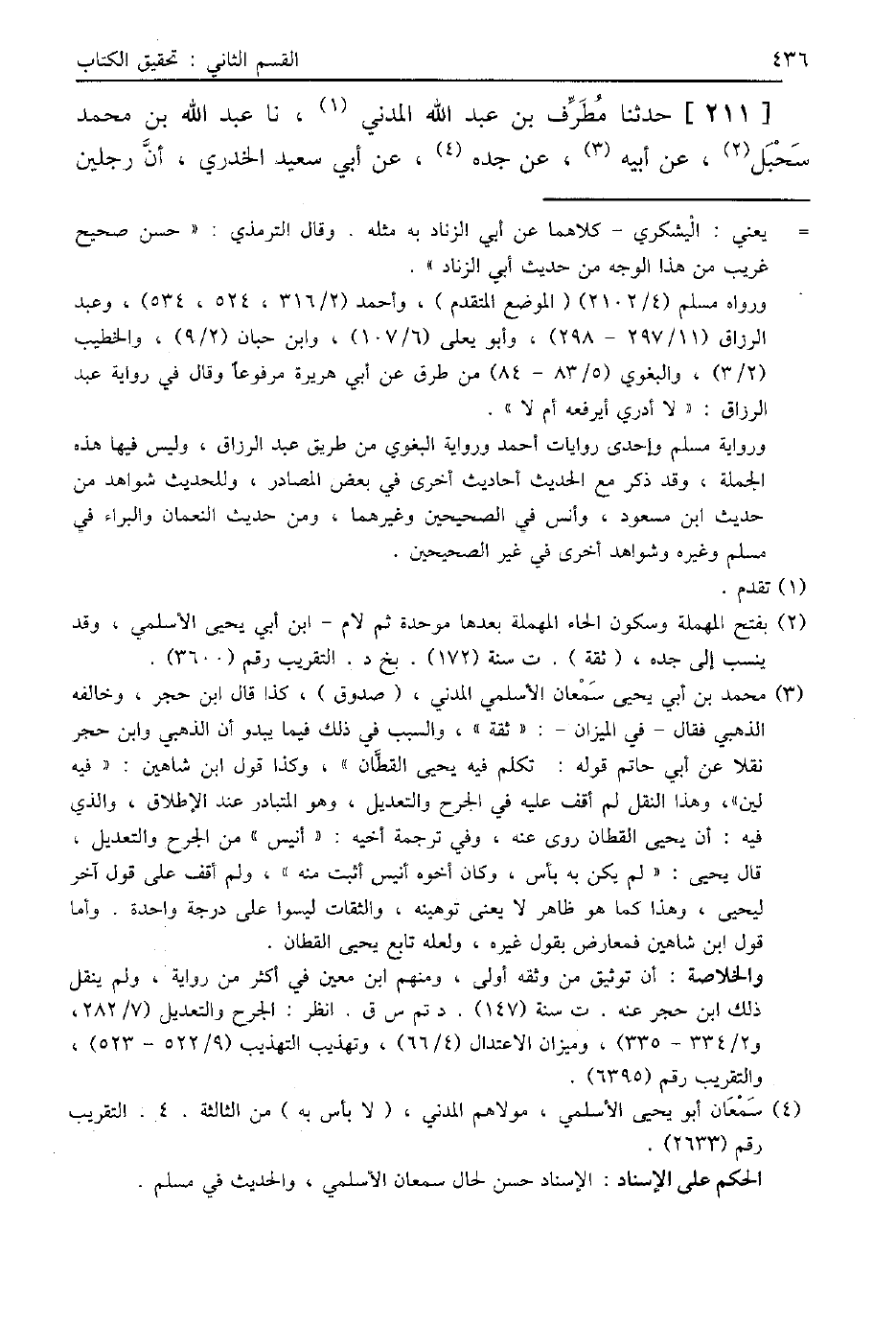 211 - حَدَّثَنَا مُطَرِّفُ بْنُ عَبْدِ اللَّهِ الْمَدَنِيُّ، نا عَبْدُ اللَّهِ بْنُ مُحَمَّدٍ سَحْبَلٌ، عَنْ أَبِيهِ، عَنْ جَدِّهِ، عَنْ أَبِي سَعِيدٍ الْخُدْرِيِّ، أَنَّ رَجُلَيْنِ -[437]- تَلَاحَيَا فِي الْمَسْجِدِ الَّذِي أُسِّسَ عَلَى التَّقْوَى، فَقَالَ أَحَدُهُمَا: هُوَ مَسْجِدُ رَسُولِ اللَّهِ صَلَّى اللهُ عَلَيْهِ وَسَلَّمَ، وَقَالَ الْآخَرُ: هُوَ مَسْجِدُ قُبَاءٍ، فَذَهَبَا إِلَى رَسُولِ اللَّهِ صَلَّى اللهُ عَلَيْهِ وَسَلَّمَ، فَسَأَلَاهُ عَنِ الْمَسْجِدِ الَّذِي أُسِّسَ عَلَى التَّقْوَى، فَقَالَ رَسُولُ اللَّهِ صَلَّى اللهُ عَلَيْهِ وَسَلَّمَ: «§الْمَسْجِدُ الَّذِي أُسِّسَ عَلَى التَّقْوَى هُوَ مَسْجِدِي هَذَا»