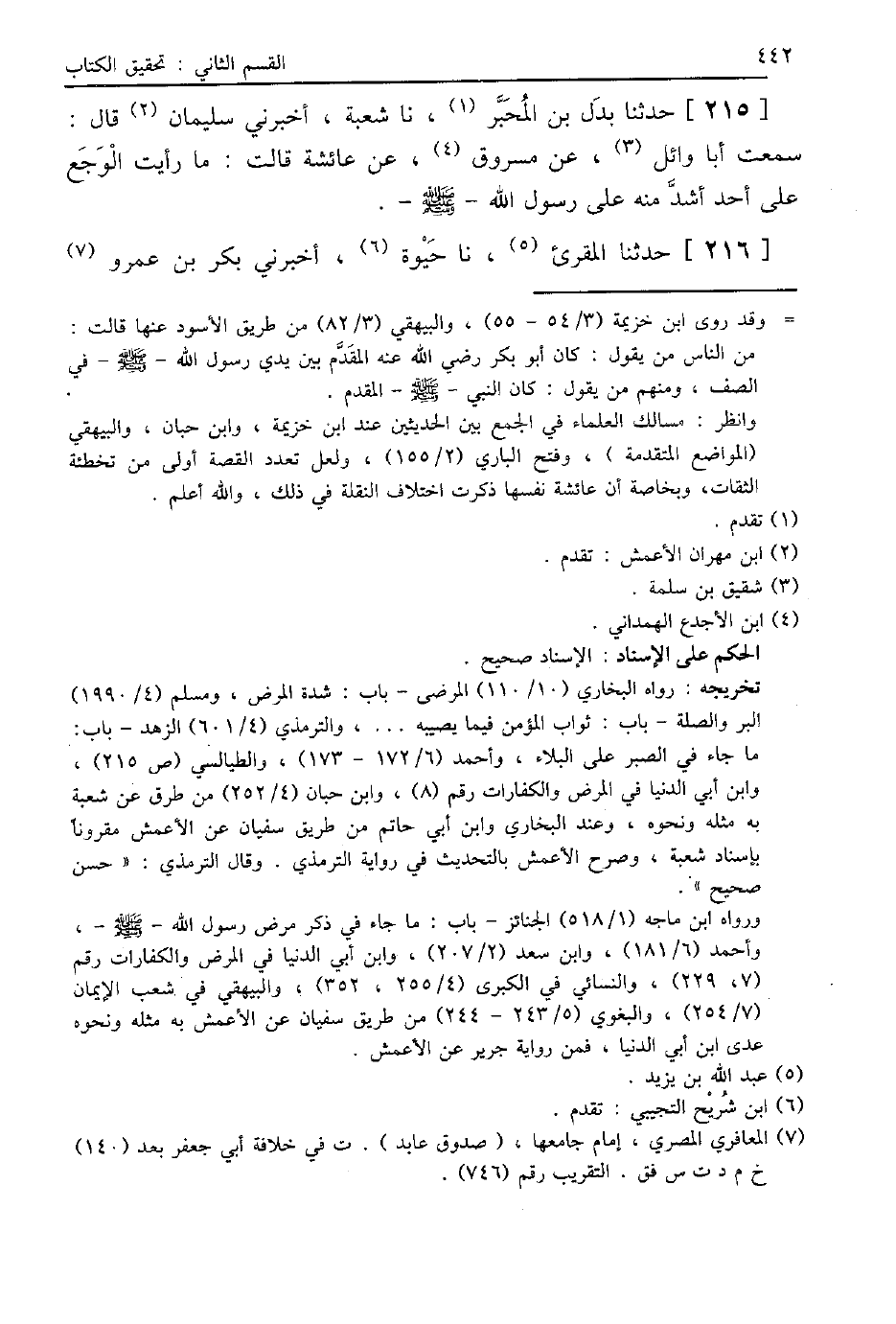 215 - حَدَّثَنَا بَدَلُ بْنُ الْمُحَبَّرِ، نا شُعْبَةُ، أَخْبَرَنِي سُلَيْمَانُ، قَالَ: سَمِعْتُ أَبَا وَائِلٍ، عَنْ مَسْرُوقٍ، عَنْ عَائِشَةَ، قَالَتْ: «§مَا رَأَيْتُ الْوَجَعَ عَلَى أَحَدٍ أَشَدَّ مِنْهُ عَلَى رَسُولِ اللَّهِ صَلَّى اللهُ عَلَيْهِ وَسَلَّمَ»