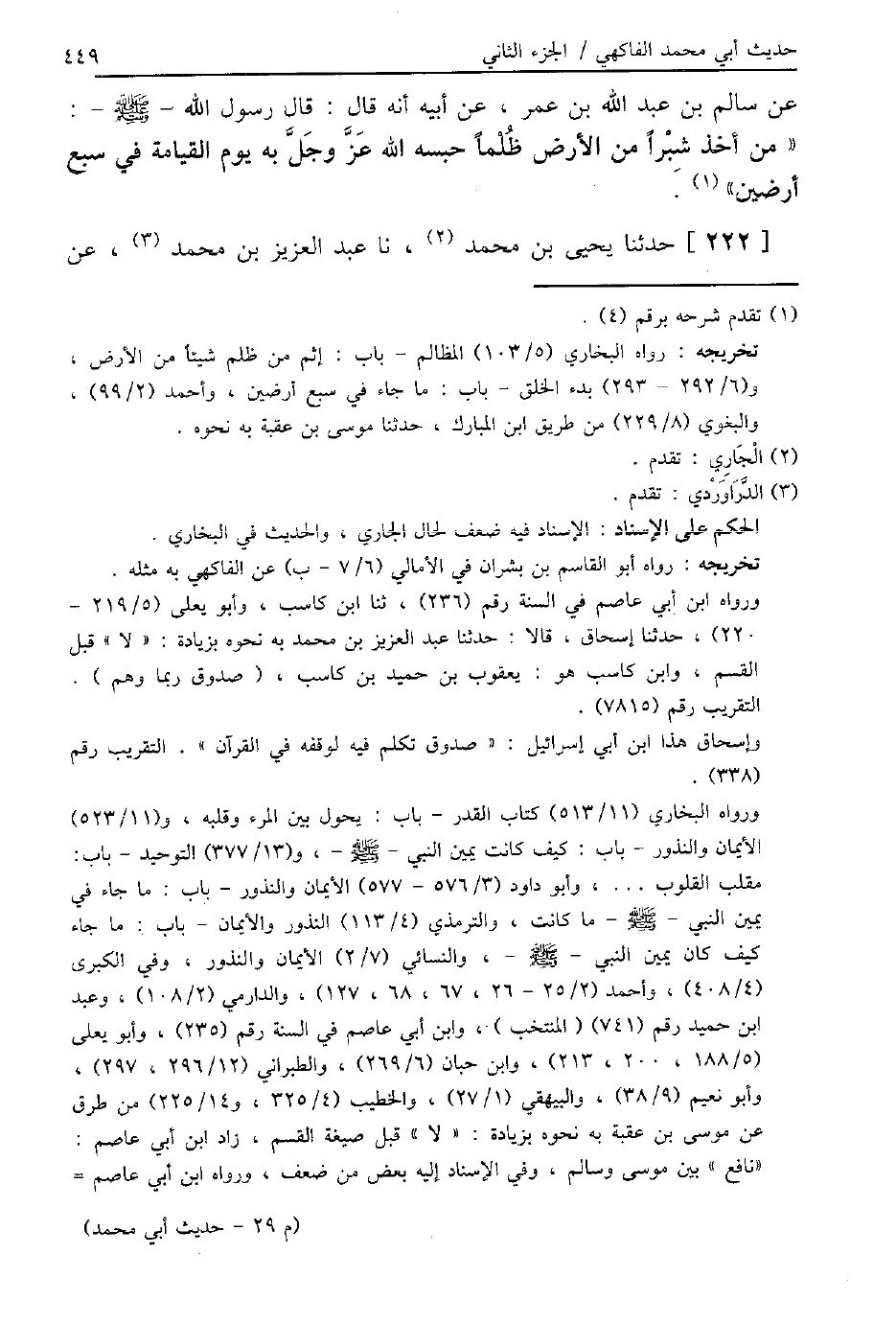 222 - حَدَّثَنَا يَحْيَى بْنُ مُحَمَّدٍ، نا عَبْدُ الْعَزِيزِ بْنُ مُحَمَّدٍ، عَنْ -[450]- مُوسَى يَعْنِي ابْنَ عُقْبَةَ، عَنْ سَالِمِ بْنِ عَبْدِ اللَّهِ، عَنْ أَبِيهِ، قَالَ: كَانَتْ مِنْ يَمِينِ رَسُولِ اللَّهِ صَلَّى اللهُ عَلَيْهِ وَسَلَّمَ يَحْلِفُ بِهَا كَثِيرًا يَقُولُ: «§وَمُقَلِّبِ الْقُلُوبِ»