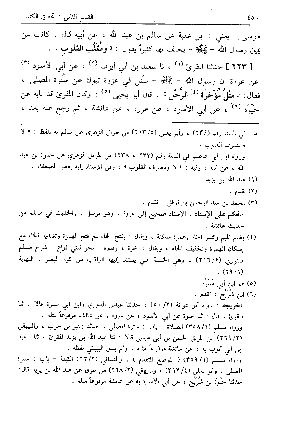 223 - حَدَّثَنَا الْمُقْرِئُ، نا سَعِيدُ بْنُ أَبِي أَيُّوبَ، عَنْ أَبِي الْأَسْوَدِ، عَنْ عُرْوَةَ، أَنَّ رَسُولَ اللَّهِ صَلَّى اللهُ عَلَيْهِ وَسَلَّمَ سُئِلَ فِي غَزْوَةِ تَبُوكَ عَنْ سُتْرَةِ الْمُصَلِّي، فَقَالَ: «§مِثْلُ مُؤَخِّرَةِ الرَّحْلِ» قَالَ أَبُو يَحْيَى: وَكَانَ الْمُقْرِئُ قَدْ نَابَهُ، عَنْ حَيْوَةَ، عَنْ أَبِي الْأَسْوَدِ، عَنْ عُرْوَةَ، عَنْ عَائِشَةَ، ثُمَّ رَجَعَ عَنْهُ بَعْدُ، -[451]- فَحَدَّثَنَا بِهِ عَنْ سَعِيدِ بْنِ أَبِي أَيُّوبَ، عَنْ أَبِي الْأَسْوَدِ، عَنْ عُرْوَةَ، وَلَيْسَ فِيهِ عَائِشَةُ