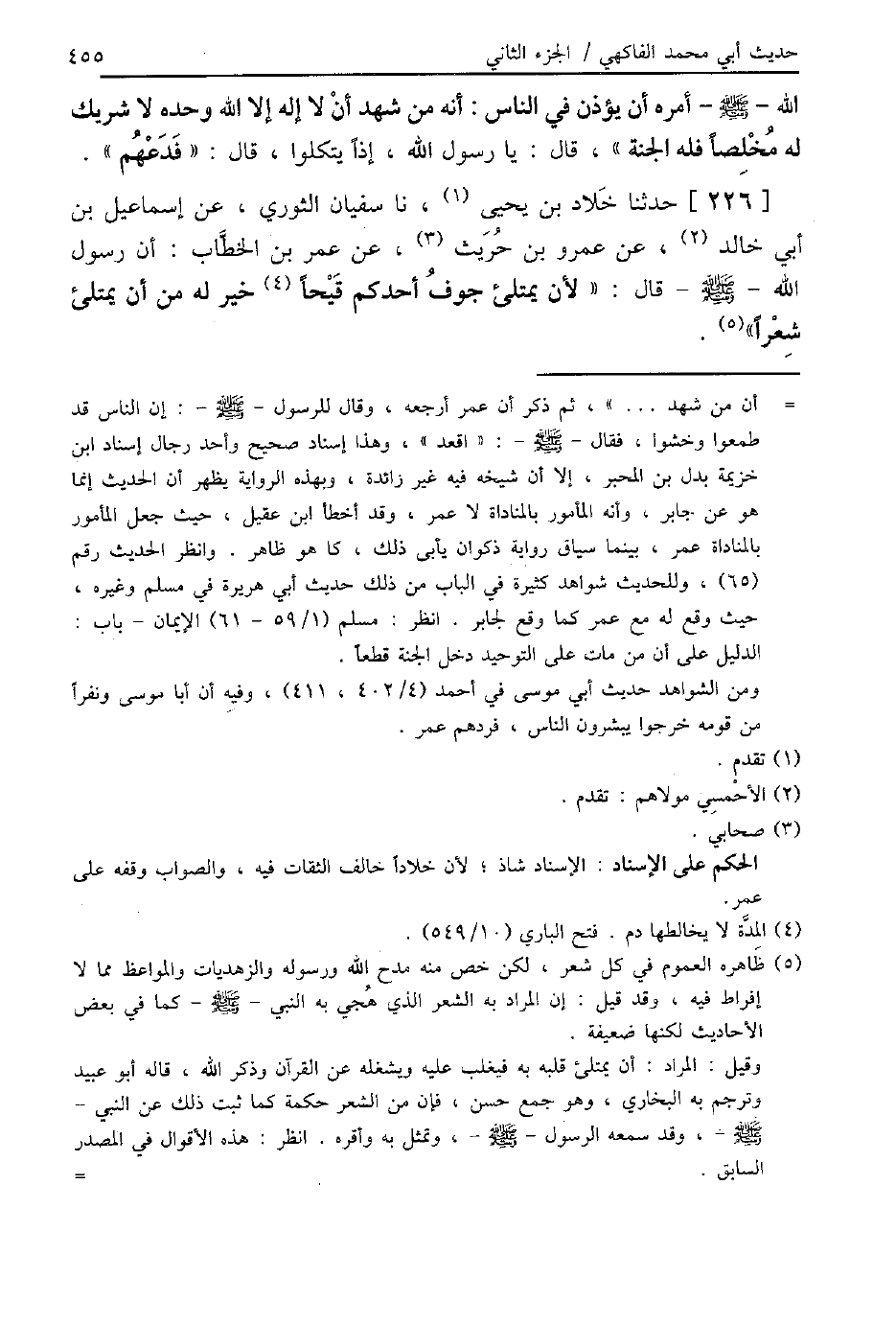 226 - حَدَّثَنَا خَلَّادُ بْنُ يَحْيَى، نا سُفْيَانُ الثَّوْرِيُّ، عَنْ إِسْمَاعِيلَ بْنِ أَبِي خَالِدٍ، عَنْ عَمْرِو بْنِ حُرَيْثٍ، عَنْ عُمَرَ بْنِ الْخَطَّابِ، أَنَّ رَسُولَ اللَّهِ صَلَّى اللهُ عَلَيْهِ وَسَلَّمَ قَالَ: «§لَأَنْ يَمْتَلِئَ جَوْفُ أَحَدِكُمْ قَيْحًا خَيْرٌ لَهُ مِنْ أَنْ يَمْتَلِئَ شِعْرًا»
