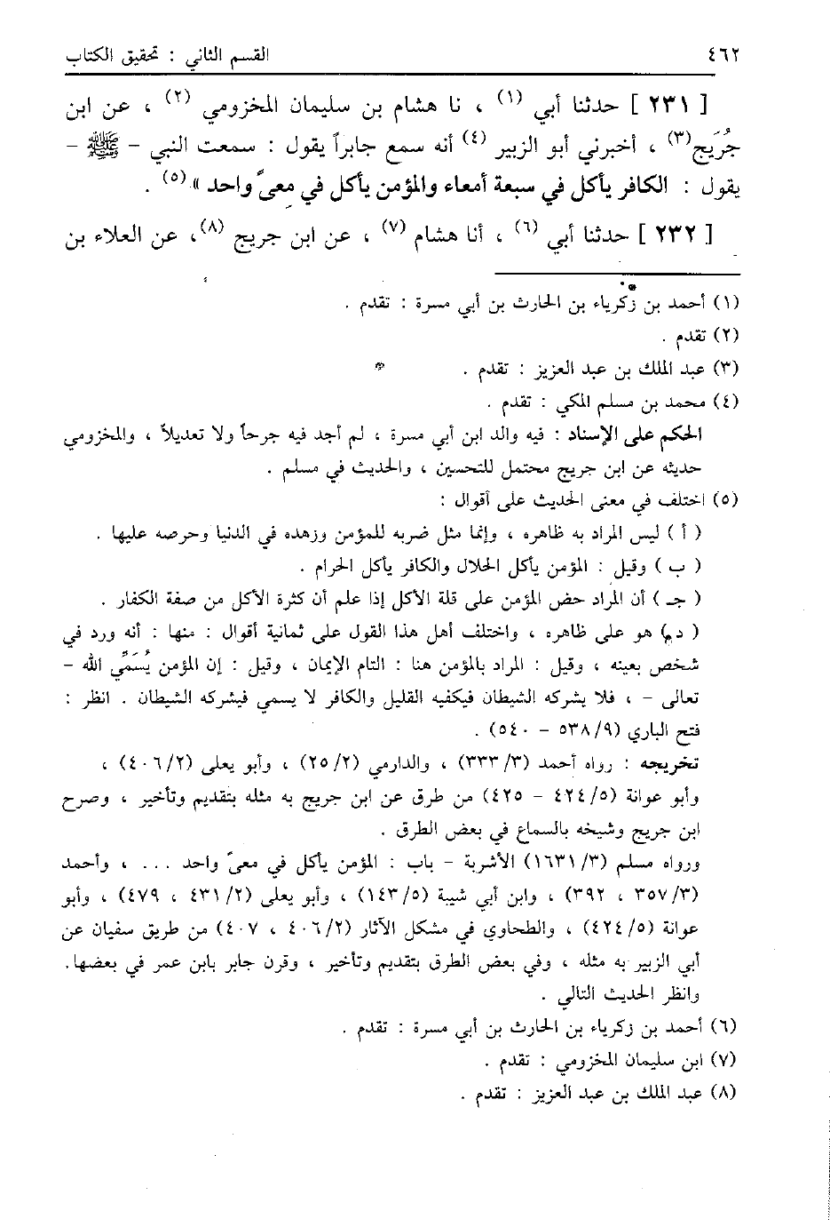 231 - حَدَّثَنَا أَبِي، نا هِشَامُ بْنُ سُلَيْمَانَ الْمَخْزُومِيُّ، عَنِ ابْنِ جُرَيْجٍ، أَخْبَرَنِي أَبُو الزُّبَيْرِ، أَنَّهُ سَمِعَ جَابِرًا، يَقُولُ: سَمِعْتُ النَّبِيَّ صَلَّى اللهُ عَلَيْهِ وَسَلَّمَ يَقُولُ: «§الْكَافِرُ يَأْكُلُ فِي سَبْعَةِ أَمْعَاءٍ وَالْمُؤْمِنُ يَأْكُلُ فِي مِعًى وَاحِدٍ»