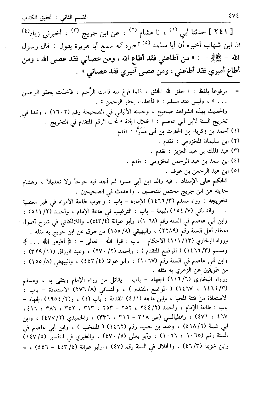 241 - حَدَّثَنَا أَبِي، نا هِشَامٌ، عَنِ ابْنِ جُرَيْجٍ، أَخْبَرَنِي زِيَادٌ، أَنَّ ابْنَ شِهَابٍ أَخْبَرَهُ , أَنَّ أَبَا سَلَمَةَ أَخْبَرَهُ , أَنَّهُ سَمِعَ أَبَا هُرَيْرَةَ، يَقُولُ: قَالَ رَسُولُ اللَّهِ صَلَّى اللهُ عَلَيْهِ وَسَلَّمَ: «§مَنْ أَطَاعَنِي فَقَدْ أَطَاعَ اللَّهَ، وَمَنْ عَصَانِي فَقَدْ عَصَى اللَّهَ، وَمَنْ أَطَاعَ أَمِيرِي فَقَدْ أَطَاعَنِي، وَمَنْ عَصَى أَمِيرِي فَقَدْ عَصَانِي»