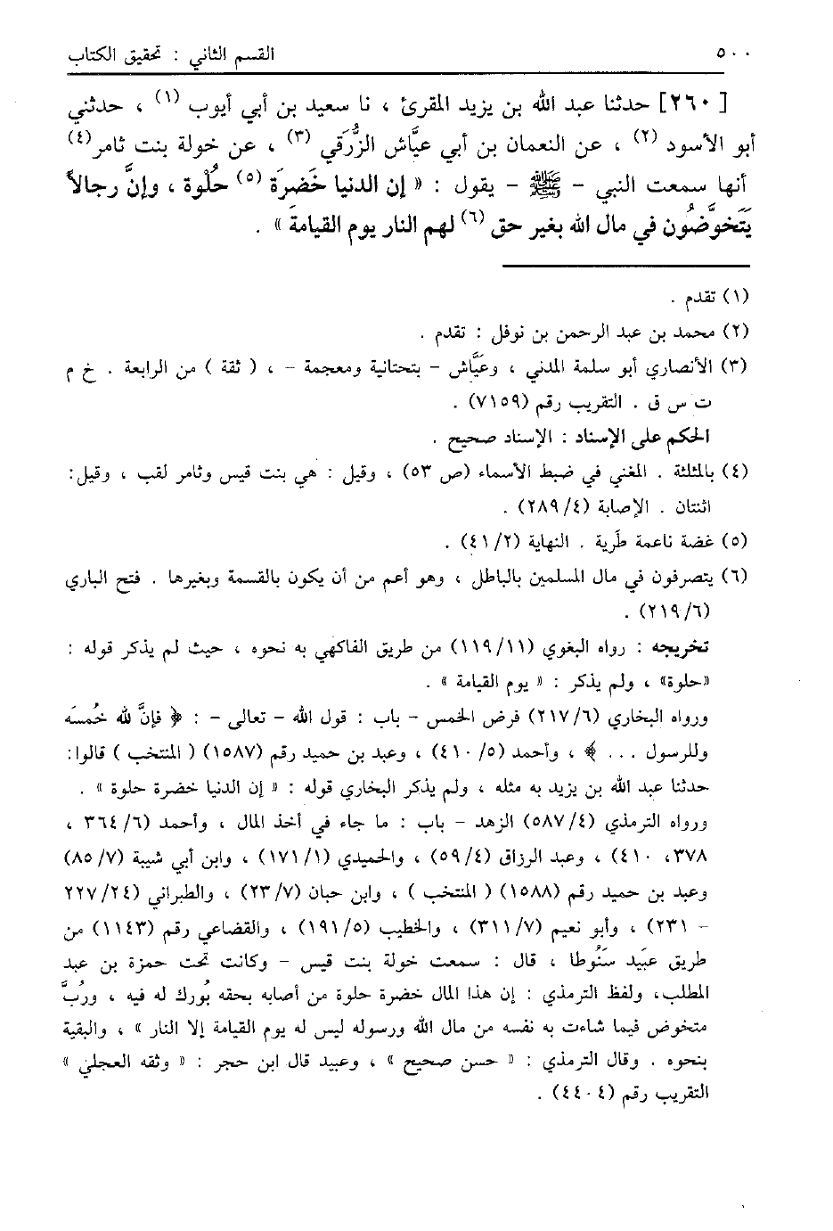260 - حَدَّثَنَا عَبْدُ اللَّهِ بْنُ يَزِيدَ الْمُقْرِئُ، نا سَعِيدُ بْنُ أَبِي أَيُّوبَ، حَدَّثَنِي أَبُو الْأَسْوَدِ، عَنِ النُّعْمَانِ بْنِ أَبِي عَيَّاشٍ الزُّرَقِيِّ، عَنْ خَوْلَةَ بِنْتِ ثَامِرٍ، أَنَّهَا سَمِعْتِ النَّبِيَّ صَلَّى اللهُ عَلَيْهِ وَسَلَّمَ يَقُولُ: «إِنَّ §الدُّنْيَا خَضِرَةٌ حُلْوَةٌ، وَإِنَّ رِجَالًا يَتَخَوَّضُونَ فِي مَالِ اللَّهِ بِغَيْرِ حَقٍّ لَهُمُ النَّارُ يَوْمَ الْقِيَامَةِ»