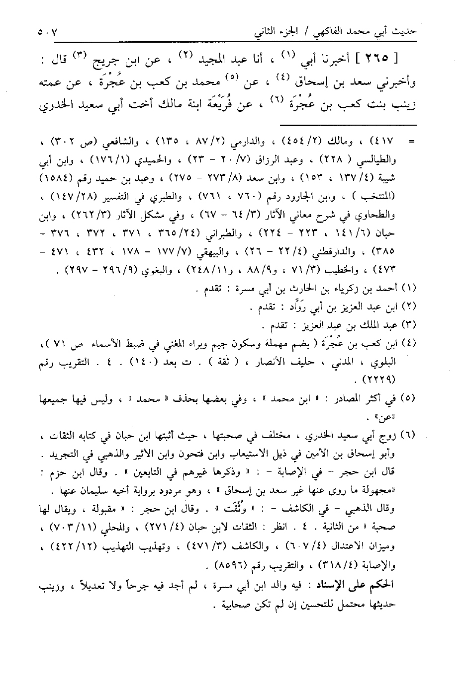 265 - أَخْبَرَنَا أَبِي، أنا عَبْدُ الْمَجِيدِ، عَنِ ابْنِ جُرَيْجٍ، قَالَ: وَأَخْبَرَنِي سَعْدُ بْنُ إِسْحَاقَ، عَنْ مُحَمَّدِ بْنِ كَعْبِ بْنِ عُجْرَةَ، عَنْ عَمَّتِهِ زَيْنَبَ بِنْتِ كَعْبِ بْنِ عُجْرَةَ، عَنْ فُرَيْعَةَ ابْنَةِ مَالِكٍ، أُخْتِ أَبِي سَعِيدٍ الْخُدْرِيِّ -[508]- أَنَّ زَوْجَهَا خَرَجَ حَتَّى إِذَا كَانَ مِنَ الْمَدِينَةِ عَلَى سِتَّةِ أَمْيَالٍ عِنْدَ طَرَفِ جَبَلٍ يُقَالَ لَهُ: الْقَدُومُ ذَهَبَ فِي طَلَبِ أُعْبُدٍ لَهُ ثَلَاثَةٍ، فَتَقَاوَوْا فَقَتَلُوهُ، وَكَانَتْ فُرَيْعَةُ فِي بَنِي الْحَارِثِ فِي مَسْكَنٍ لَمْ يَكُنْ لِبَعْلِهَا، إِنَّمَا كَانَ سَكَنَهُمَا فَجَاءَ إِخْوَتُهَا , فِيهِمْ أَبُو سَعِيدٍ الْخُدْرِيُّ فَقَالُوا: لَيْسَ بَأَيْدِينَا سَعَةٌ فَنُعْطِيكِ وَنُسْكِنُكِ، وَلَا يُصْلِحُنَا إِلَّا أَنْ نَكُونَ جَمِيعًا، وَنَخْشَى عَلَيْكِ الْوَحْشَ، فَسَلِي النَّبِيَّ صَلَّى اللهُ عَلَيْهِ وَسَلَّمَ، فَجَاءَتِ النَّبِيَّ صَلَّى اللهُ عَلَيْهِ وَسَلَّمَ فَقَصَّتْ عَلَيْهِ مَا قَالَ إِخْوَتُهَا، فَاسْتَأْذَنَتْهُ فِي أَنْ تَعْتَدَّ عِنْدَ إِخْوَتِهَا، فَقَالَ: «افْعَلِي إِذَا شِئْتِ» ، فَأَدْبَرَتْ حَتَّى إِذَا كَانَتْ فِي الْحُجْرَةِ، فَقَالَ: «تَعَالَيْ عُودِي لِمَا قُلْتِ» ، فَعَادَتْ، فَقَالَ: «§امْكُثِي فِي بَيْتِكِ حَتَّى يَبْلُغَ الْكِتَابُ أَجَلَهُ» ، ثُمَّ إِنَّ عُثْمَانَ بُعِثَتْ إِلَيْهِ امْرَأَةٌ تَسْأَلُهُ أَنْ تَنْتَقِلَ مِنْ بَيْتِ زَوْجِهَا فَتَعْتَدَّ فِي غَيْرِهِ، قَالَ: «افْعَلِي» ، فَقَالَ لِمَنْ حَوْلَهُ: هَلْ مَضَى مِنَ النَّبِيِّ صَلَّى اللهُ عَلَيْهِ وَسَلَّمَ أَوْ مِنْ صَاحِبَيَّ فِي مِثْلِ هَذَا مِنْ شَيْءٍ؟ فَقَالُوا: إِنَّ فُرَيْعَةَ بِنْتَ مَالِكٍ تُحَدِّثُ عَنِ النَّبِيِّ صَلَّى اللهُ عَلَيْهِ وَسَلَّمَ، فَأَرْسَلَ إِلَيْهَا فَأَخْبَرَتْهُ، فَانْتَهَى إِلَى قَوْلِهَا، وَأَمَرَ الْمَرْأَةَ أَنْ لَا تَخْرُجَ مِنْ بَيْتِهَا