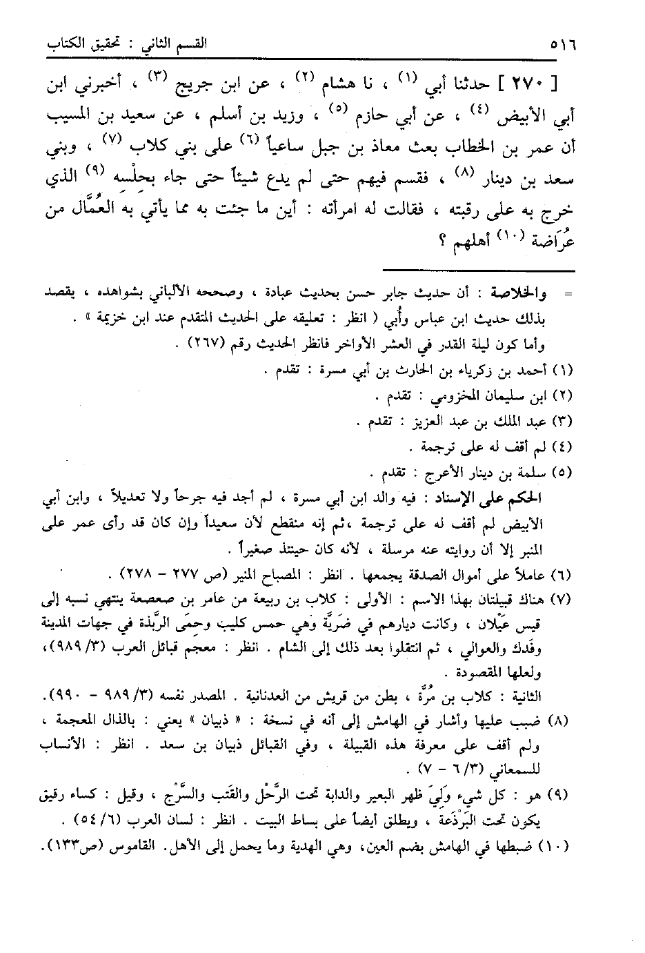 270 - حَدَّثَنَا أَبِي، نا هِشَامٌ، عَنِ ابْنِ جُرَيْجٍ، أَخْبَرَنِي ابْنُ أَبِي الْأَبْيَضِ، عَنْ أَبِي حَازِمٍ، وَزَيْدِ بْنِ أَسْلَمَ، عَنْ سَعِيدِ بْنِ الْمُسَيِّبِ، أَنَّ عُمَرَ بْنَ الْخَطَّابِ بَعَثَ مُعَاذَ بْنَ جَبَلٍ سَاعِيًا عَلَى بَنِي كِلَابٍ، وَبَنِي سَعْدِ بْنِ دِينَارٍ، فَقَسَمَ فِيهِمْ حَتَّى لَمْ يَدَعْ شَيْئًا، حَتَّى جَاءَ بِحِلْسِهِ الَّذِي خَرَجَ بِهِ عَلَى رَقَبَتِهِ، فَقَالَتْ لَهُ امْرَأَتُهُ: أَيْنَ مَا جِئْتَ بِهِ مِمَّا يَأْتِي بِهِ الْعُمَّالُ مِنْ عُرَاضَةِ أَهْلِهِمْ؟ -[517]- قَالَ: كَانَ مَعِيَ ضَاغِطٌ، فَقَالَتْ: قَدْ كُنْتَ أَمِينًا عِنْدَ رَسُولِ اللَّهِ صَلَّى اللهُ عَلَيْهِ وَسَلَّمَ وَأَبِي بَكْرٍ، أَوَ بَعَثَ عُمَرُ مَعَكَ ضَاغِطًا؟ فَقَامَتْ بِذَلِكَ فِي نِسَائِهَا وَاشْتَكَتْ عُمَرَ، فَبَلَغَ عُمَرُ، فَدَعَا مُعَاذًا فَقَالَ: «§أَنَا بُعِثْتُ مَعَكَ ضَاغِطًا» ؟ قَالَ: لَمْ أَجِدْ شَيْئًا أَعْتَذِرُ بِهِ إِلَيْهَا إِلَّا ذَلِكَ، فَضَحِكَ عُمَرُ وَأَعْطَاهُ شَيْئًا، فَقَالَ: «أَرْضِهَا بِهِ» قَالَ ابْنُ جُرَيْجٍ: وَأَقُولُ: قَوْلُ مُعَاذٍ: الضَّاغِطُ: يُرِيدُ بِهِ