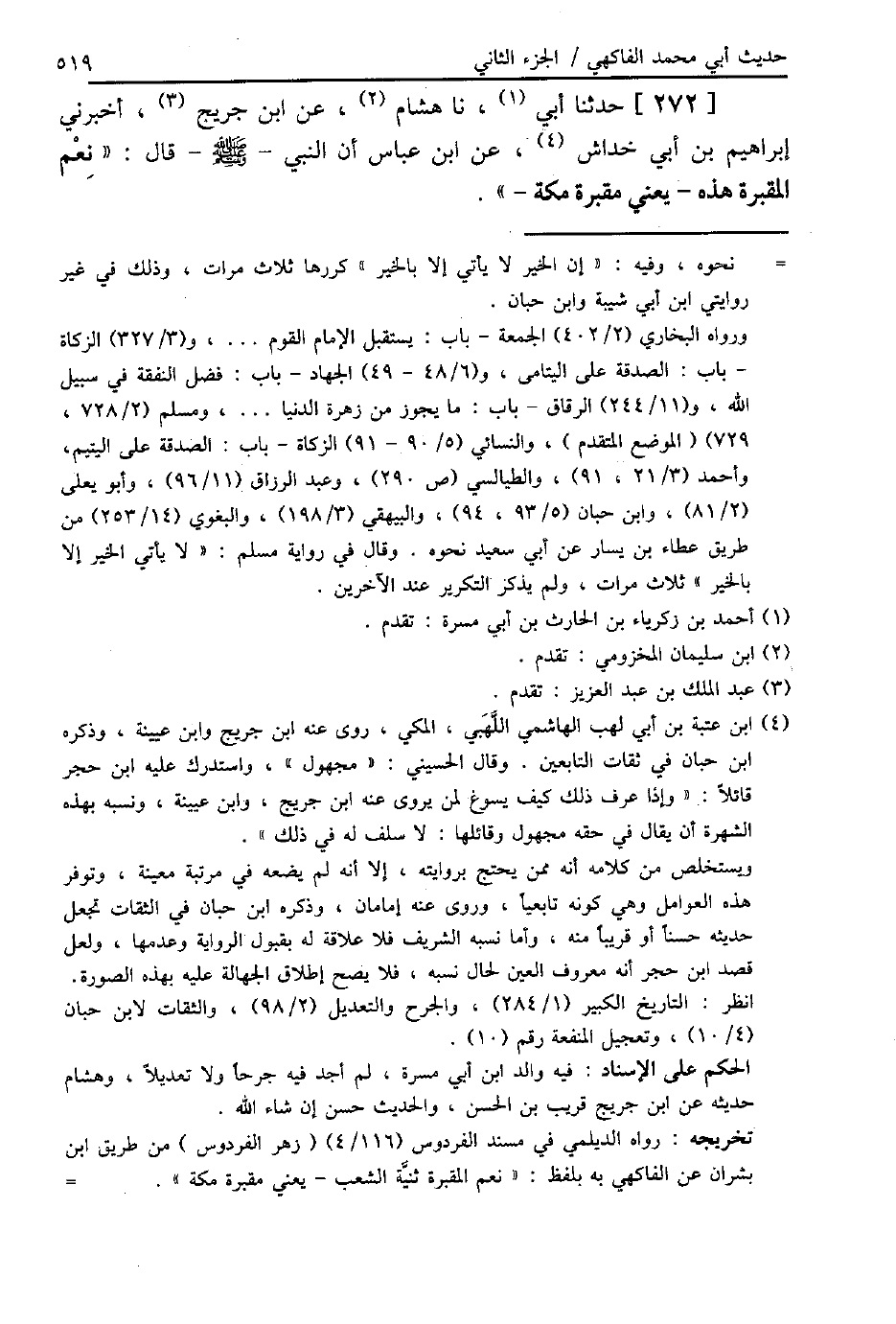 272 - حَدَّثَنَا أَبِي، نا هِشَامٌ، عَنِ ابْنِ جُرَيْجٍ، أَخْبَرَنِي إِبْرَاهِيمُ بْنُ أَبِي خِدَاشٍ، عَنِ ابْنِ عَبَّاسٍ، أَنَّ النَّبِيَّ صَلَّى اللهُ عَلَيْهِ وَسَلَّمَ قَالَ: «§نِعْمَ الْمَقْبَرَةُ هَذِهِ» يَعْنِي مَقْبَرَةَ مَكَّةَ