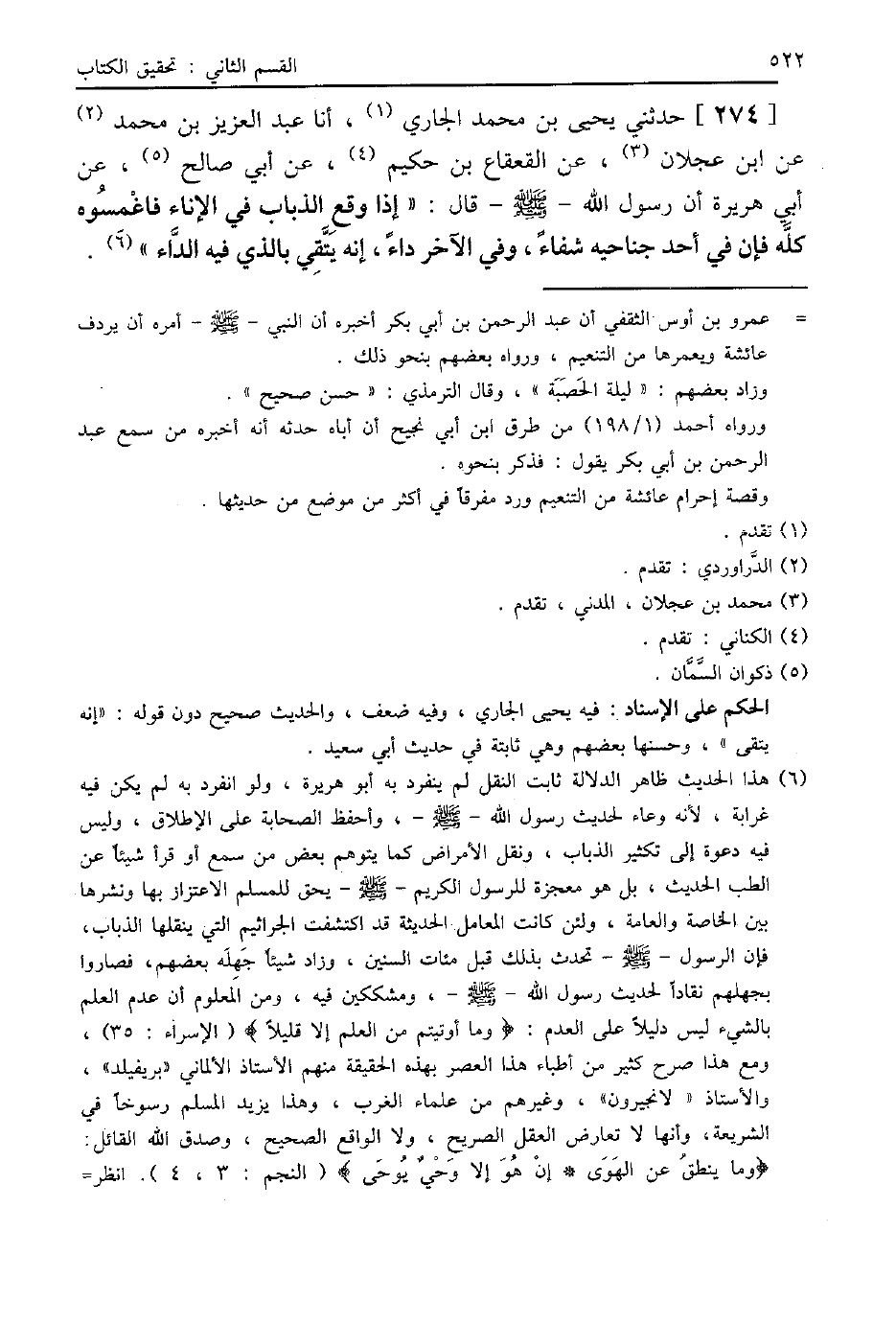 274 - حَدَّثَنِي يَحْيَى بْنُ مُحَمَّدٍ الْجَارِيُّ، أنا عَبْدُ الْعَزِيزِ بْنُ مُحَمَّدٍ، عَنِ ابْنِ عَجْلَانَ، عَنِ الْقَعْقَاعِ بْنِ حَكِيمٍ، عَنْ أَبِي صَالِحٍ، عَنْ أَبِي هُرَيْرَةَ، أَنَّ رَسُولَ اللَّهِ صَلَّى اللهُ عَلَيْهِ وَسَلَّمَ قَالَ: «§إِذَا وَقَعَ الذُّبَابُ فِي الْإِنَاءِ فَاغْمِسُوهُ كُلَّهُ فَإِنَّ فِي أَحَدِ جَنَاحَيْهِ شِفَاءً، وَفِي الْآخَرِ دَاءً، إِنَّهُ يَتَّقِي بِالَّذِي فِيهِ الدَّاءُ»