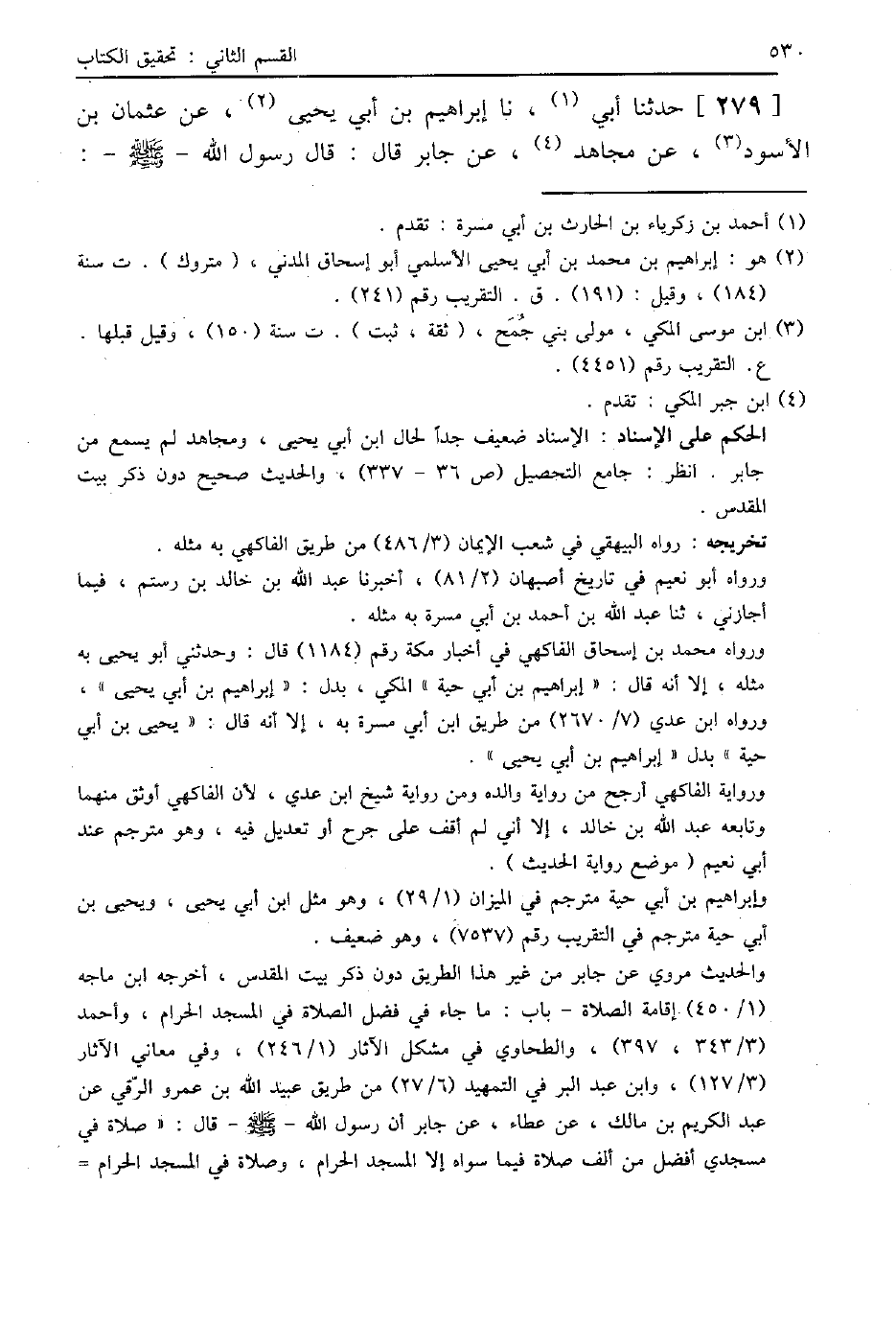 279 - حَدَّثَنَا أَبِي، نا إِبْرَاهِيمُ بْنُ أَبِي يَحْيَى، عَنْ عُثْمَانَ بْنِ الْأَسْوَدِ، عَنْ مُجَاهِدٍ، عَنْ جَابِرٍ، قَالَ: قَالَ رَسُولُ اللَّهِ صَلَّى اللهُ عَلَيْهِ وَسَلَّمَ: -[532]- «§صَلَاةٌ فِي الْمَسْجِدِ الْحَرَامِ مِائَةُ أَلْفِ صَلَاةٍ وَصَلَاةٌ فِي مَسْجِدِي أَلْفُ صَلَاةٍ وَصَلَاةٌ فِي بَيْتِ الْمَقْدِسِ خَمْسُمِائَةِ صَلَاةٍ»