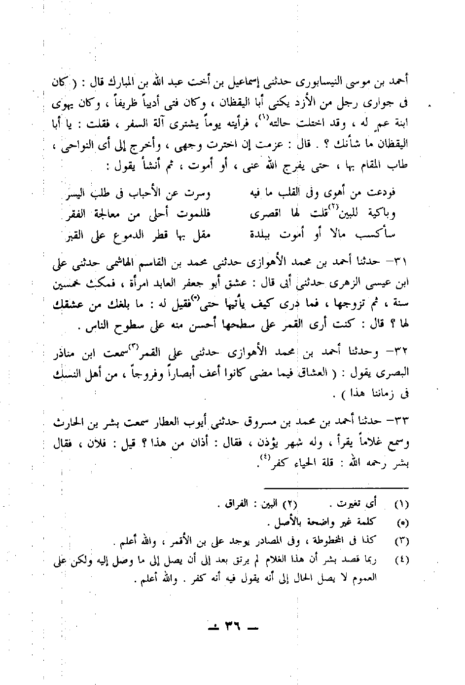 31 - حَدَّثَنَا أَحْمَدُ بْنُ مُحَمَّدٍ الْأَهْوَازِيُّ، حَدَّثَنِي مُحَمَّدُ بْنُ الْقَاسِمِ الْهَاشِمِيُّ، حَدَّثَنِي عَلِيُّ بْنُ عِيسَى الزُّهْرِيُّ، حَدَّثَنِي أَبِي قَالَ،: عَشِقَ أَبُو جَعْفَرٍ الْعَابِدُ امْرَأَةً، فَمَكَثَ خَمْسِينَ سَنَةً، ثُمَّ تَزَوَّجَهَا، فَمَا دَرَى كَيْفَ يَأْتِيهَا حَتَّى. . . . . . . . . . . فقِيلَ لَهُ: مَا بَلَغَكَ مِنْ عِشْقِكَ لَهَا؟ قَالَ: «§كُنْتُ أَرَى الْقَمَرَ عَلَى سَطْحِهَا أَحْسَنَ مِنْهُ عَلَى سُطُوحِ النَّاسِ»