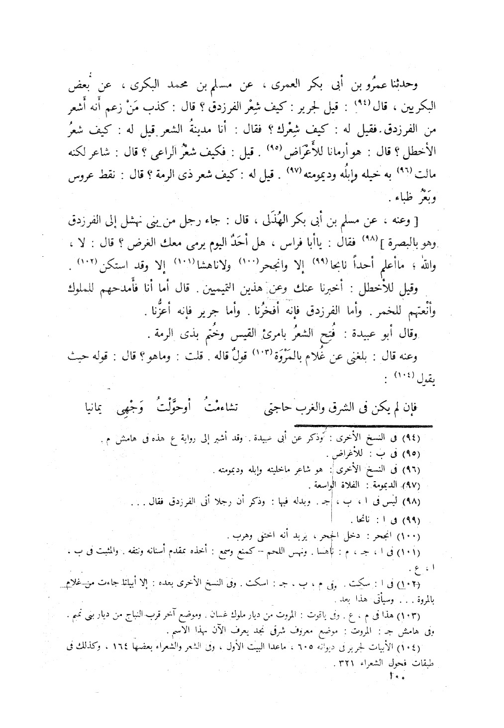 وقال أبو عبيدة: فتح الشعر بامرىء القيس، وختم بذي الرمة، رواه أبو عبيدة عن أبي عمرو بن العلاء. وعنه: عن مسلم عن أبي بكر المديني قال: جاء رجل من بني نهشل إلى الفرزدق، وهو بالبصرة، فقال: يا أبا فراس! هل أحد اليوم يرمي معك؟ قال: والله ما أعلم نابحاً إلا وقد انحجر، ولا ناهساً إلا وقد أسكت، إلا أبياتاً جاءت من غلام بالمروة. قال: وما هي؟ قال قوله: الطويل