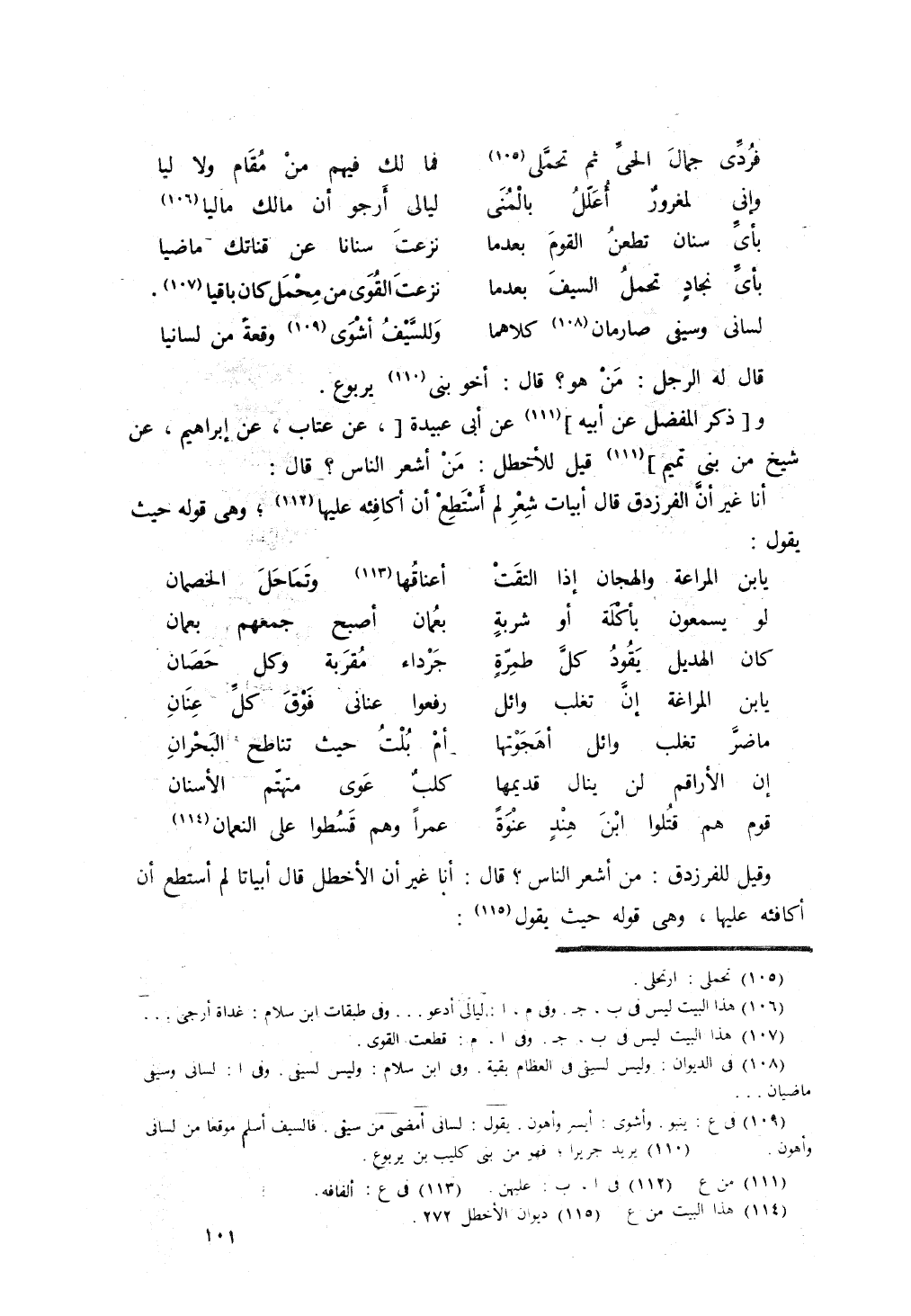 وقال أبو عبيدة: قيل للأخطل: أنت أشعر أم الفرزدق؟ قال: أنا، غير أن الفرزدق قال أبياتاً ما استطعت أن أكافئه عليها: الكامل