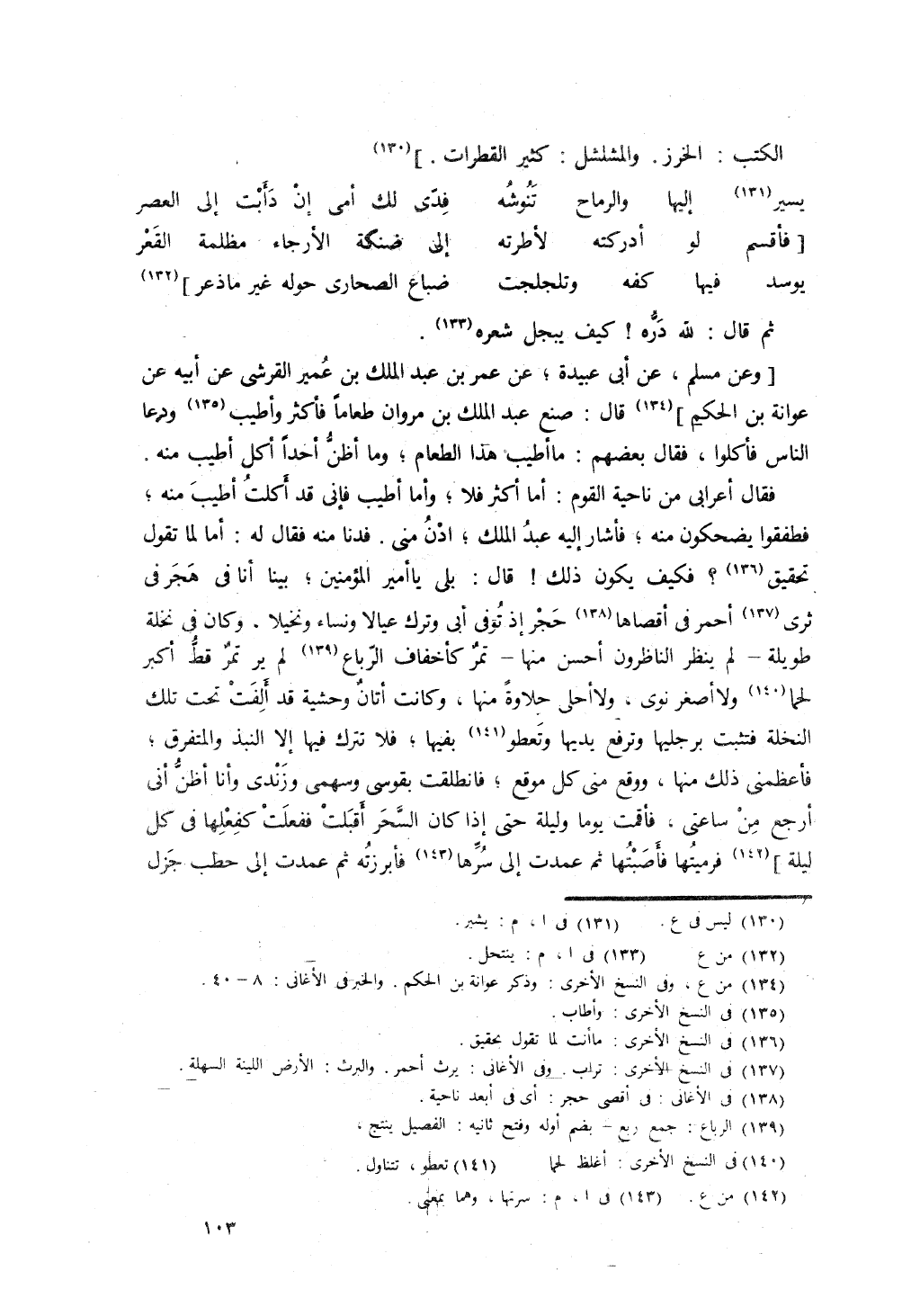 وذكر عوانة بن الحكم: أن عبد الملك بن مروان صنع طعاماً، فأكثر، وأطاب ودعا الناس، فأكلوا، فقال بعضهم: ما أطيب هذا الطعام وما أكثره، وما أظن أحداً أكل أطيب منه. فقال أعرابي من ناحية القوم: أما أكثر، فلا! وأما أطيب فقد أكلت أطيب منه. فطفقوا يضحكون، فأشار إليه عبد الملك، فدنا منه، فقال: ما أنت لما تقول بحقيقٍ. قال: بلى، يا أمير المؤمنين؛ بينا أنا بهجر في ترابٍ أحمر في أقصاها حجراً إذ توفي أبي وترك كلا وعيالاً ونساء ونخلاً، وفي النخل نخلةٌ لم ير الناظرون مثلها، كأخفاف الرباع ولم ير تمرٌ قط أغلظ لحماً ولا أصغر نوىً، ولا أحلى حلاوةً منها. وكانت أتانٌ وحشيةٌ قد ألفت تلك النخلة، فتثبت برجليها، وترفع يديها وتعطو بفيها، وكادت تنفذ ما فيها، فانطلقت بقوسي وكنانتي وأسهمي وزندي، وأنا أظنني أرجع من ساعتي، فمكثت يوماً وليلة، حتى إذا كان السحر، أقبلت فرميتها فأصبتها، ثم عمدت إلى سرتها، فأبرزتها، ثم عمدت إلى حطبٍ جزلٍ