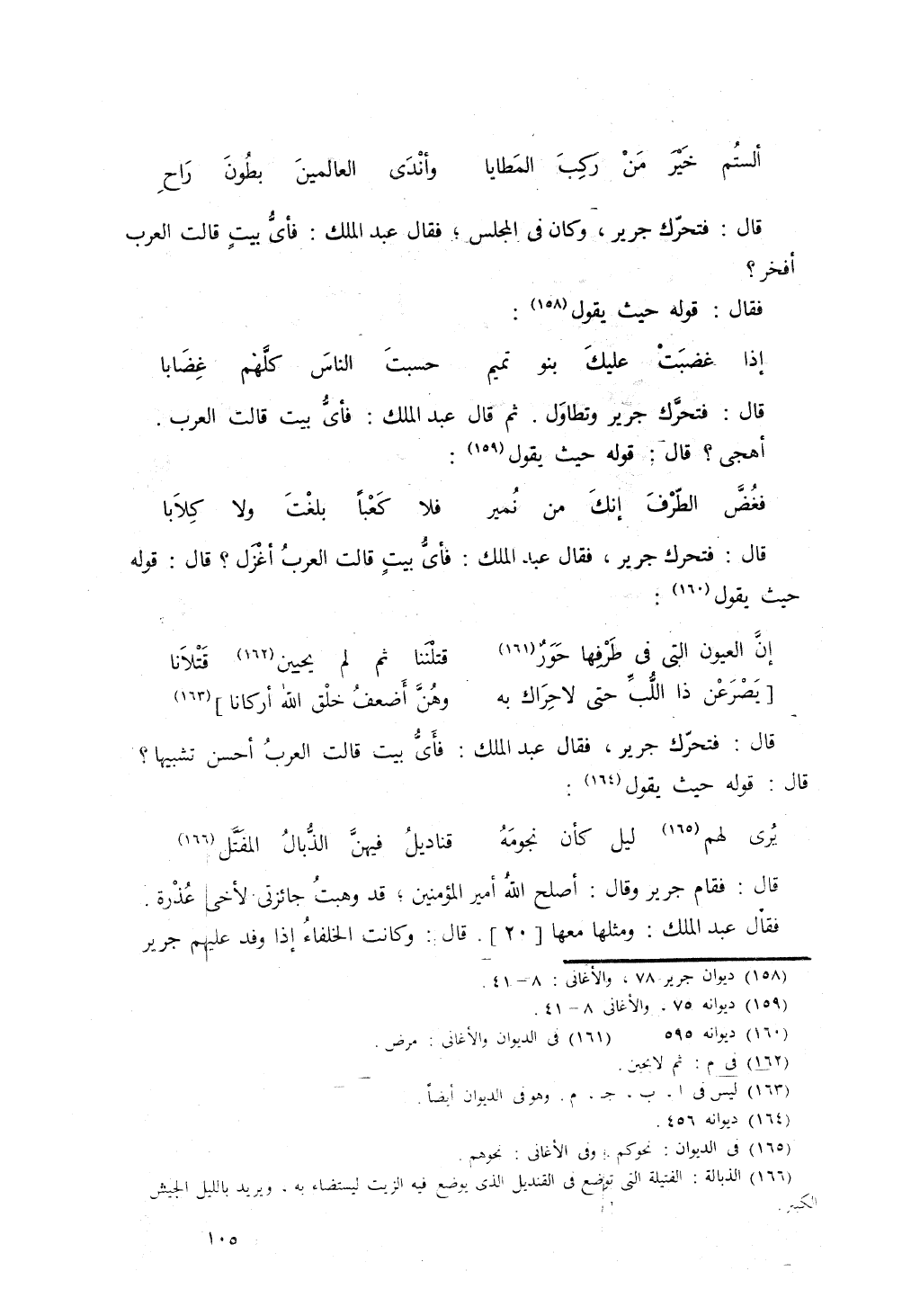 قال: وكان جرير في القوم، فتحرك ورفع رأسه. قال عبد الملك: فأي بيتٍ قالت العرب أفخر؟ قال قوله: الوافر
