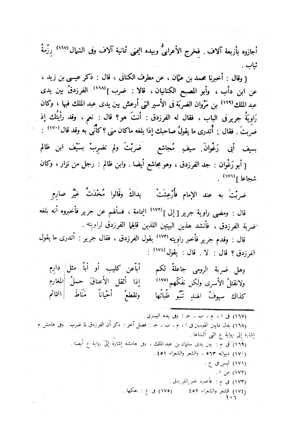 ذكر أن الفرزدق لما ضرب بين يدي سليمان بن عبد الملك بن مروان الضربة في الأسير فرعشت يده وكان راوية جرير بالباب، فقال: أنت هو؟ فقال: نعم! وقد رأيتك إذ ضربت؛ قال: أتدري ما يقول صاحبك إذا بلغه ما كان؟ كأني به قد قال: الطويل