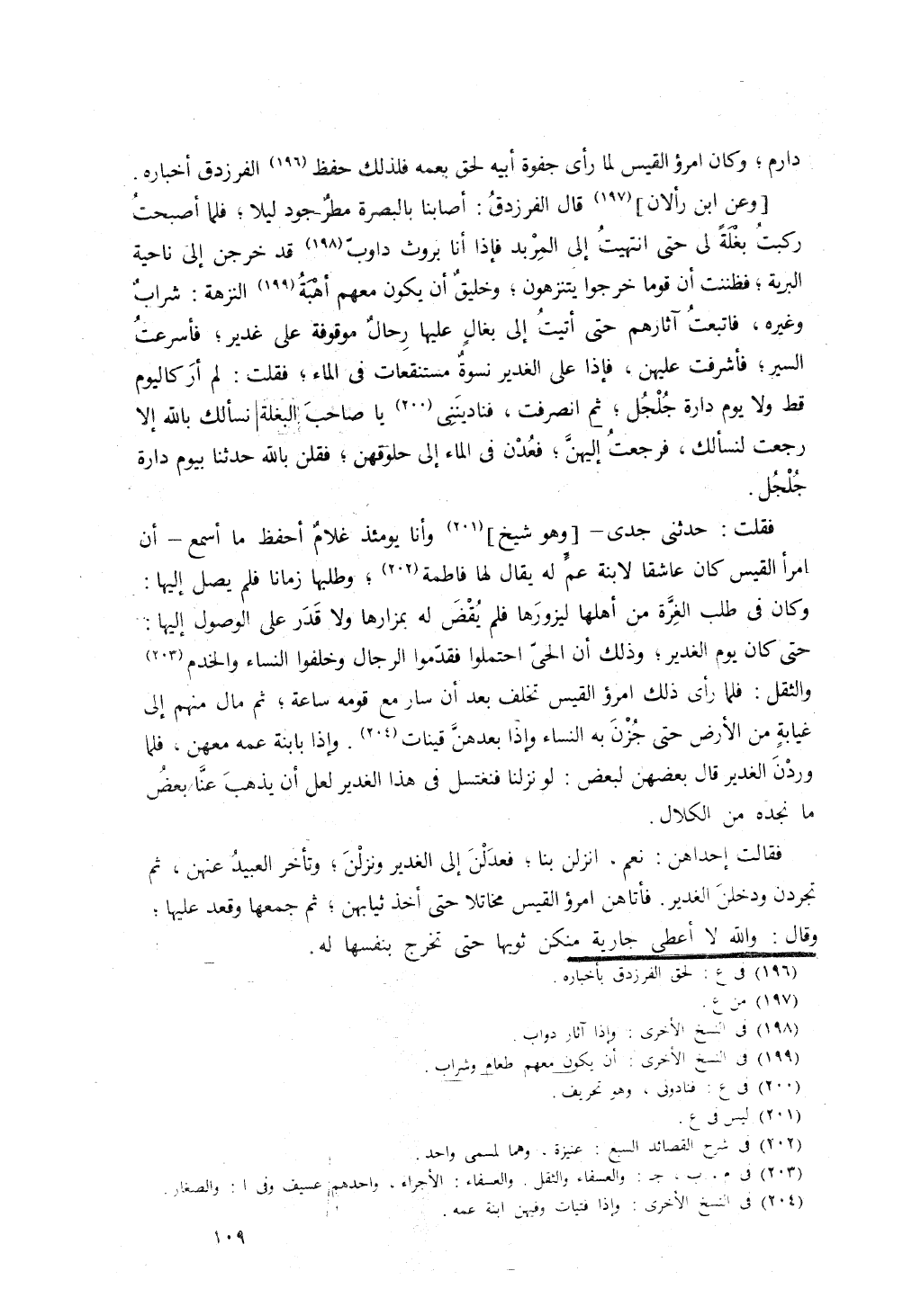 حدثني جدي وهو شيخٌ وأنا غلامٌ يومئذٍ حافظٌ لما أسمع أن امرأ القيس كان مولعاً بابنة عمٍ له، يقال لها فاطمة، وأنه طلبها زماناً فلم يصل إليها، حتى كان يوم الغدير، وذلك أن الحي احتملوا وقدموا الرجال وخلفوا النساء والخدم والعسفاء والثقل. فلما رأى لك امرؤ القيس تخلف عن قومه في غيابة من الأرض حتى مرت به النساء. وإذا فتياتٌ وفيهن إبنة عمه، فلما وردن الغدير قلن: لو نزلنا فاغتسلنا وذهب عنا بعض ما نجد من الكلال. فقالت إحداهن: نعم! فنزلن فنحين ثيابهن، ثم تجردن فدخلن الغدير. قال: فأتاهن امرؤ القيس مخاتلاً فأخذ ثيابهن، ثم جمعها وقعد عليها وقال: والله لا أعطي واحدةً منكن ثوبها حتى تخرج كما هي فتكون هي التي تأخذه؛