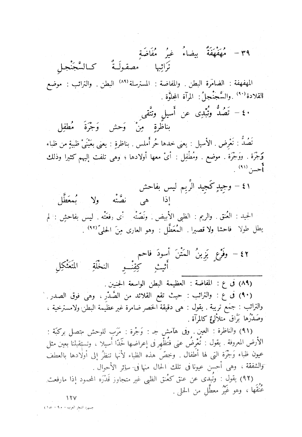 مُهَفهَفَةٌ بَيضاءُ، غَيرُ مُفَاضَةٍ ... تَرائِبُها مَصْقُولَةٌ كالسَّجَنْجَلِ