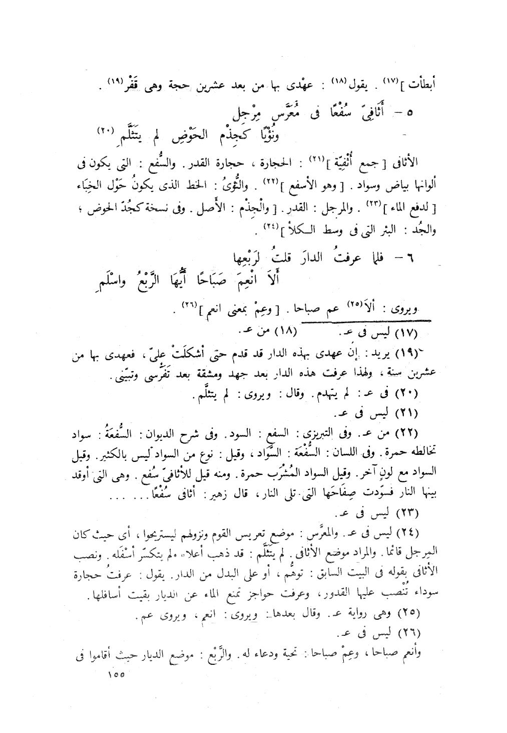 أَثافيَّ سُفْعاً في مُعَرَّسِ مِرْجَلٍ ... وَنْؤياً كَجِذْمِ الحَوضِ لم يَتَثَلَّمِ