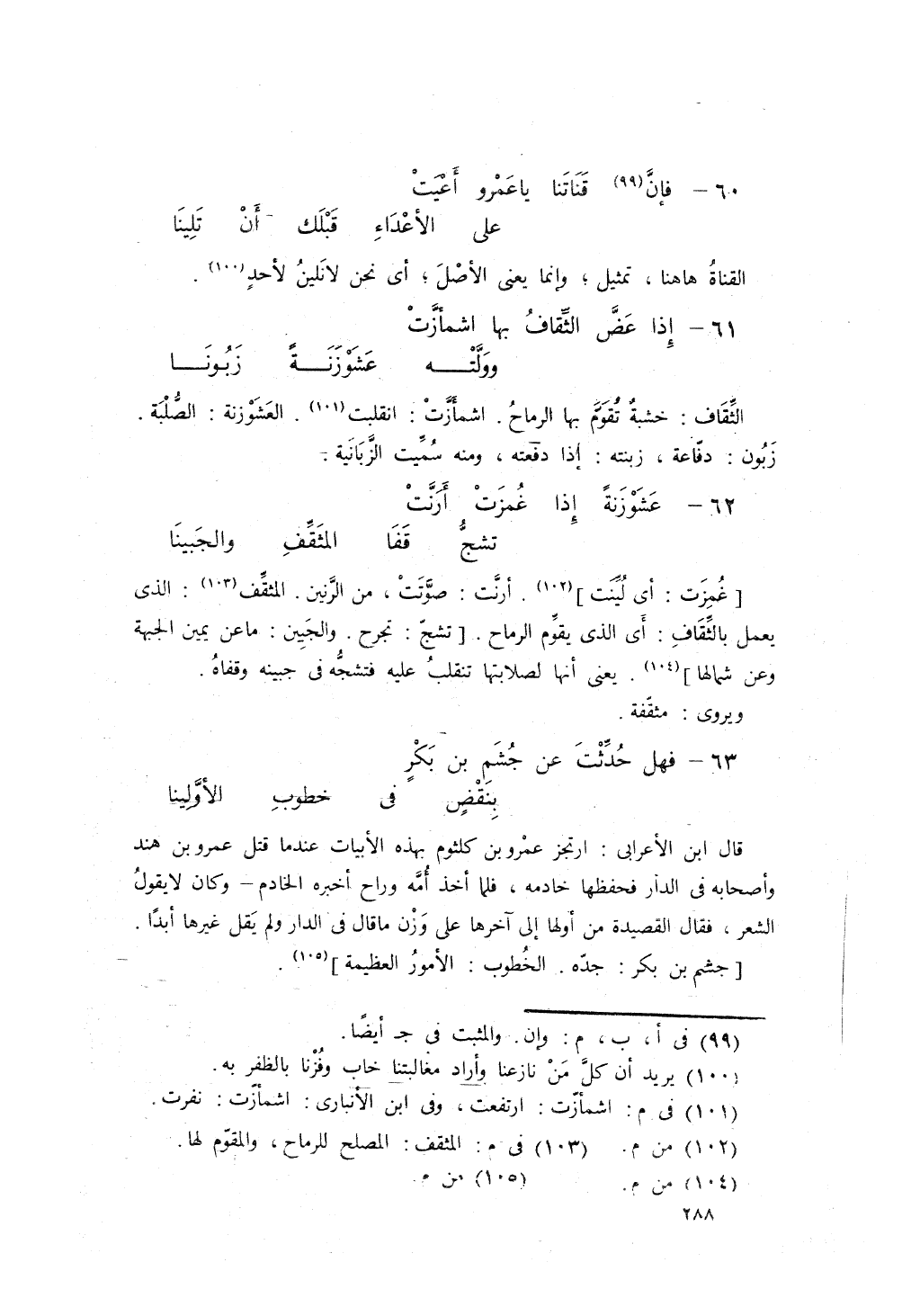 عَشَوْزَنَةً إذا غُمِزَتْ أَرَنَّتْ ... تَشُجُّ قَفَا المُثَقَّفِ وَالجَبِينَا