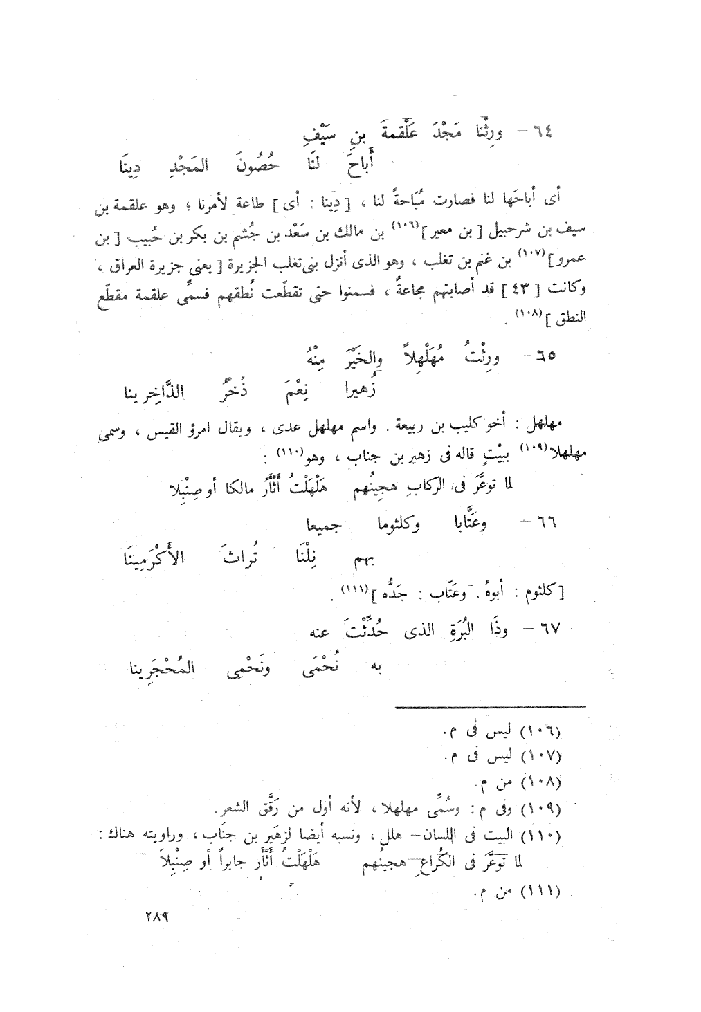 وَرِثْتُ مُهَلهَلاً، والخَيرَ منهُ، ... زُهَيراً، نِعمَ ذُخرُ الذَّاخِرينَا