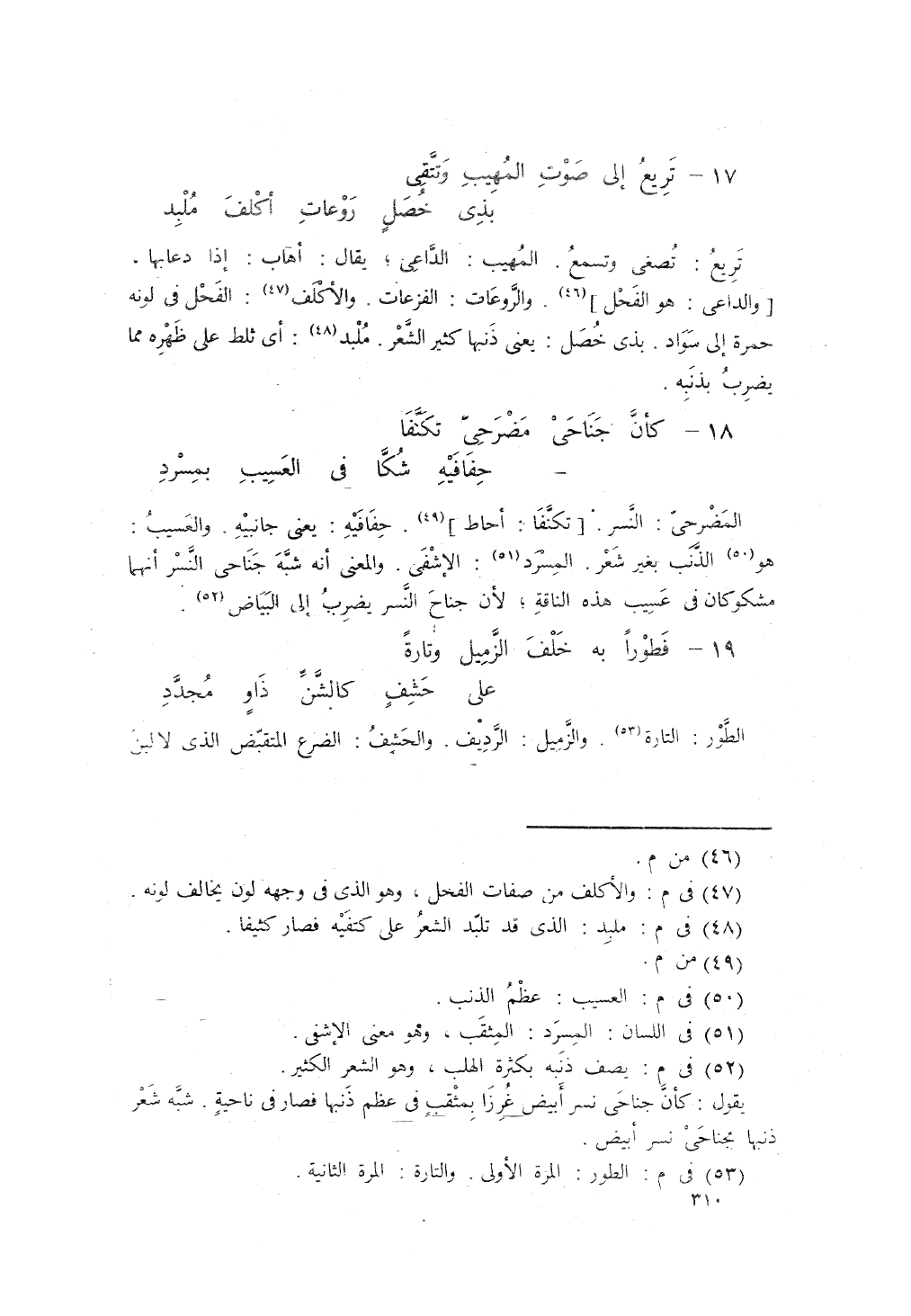 كَأَنّ جَنَاحَيْ مَضْرَحيّ تَكَنّفَا ... حِفافَيْهِ شُكّا في العَسيبِ بِمسْرَدِ