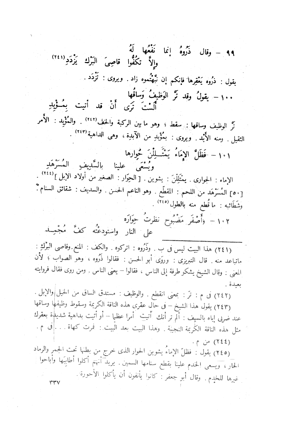 فَظَلَّ الإِماءُ يَمتَلِلْنَ حُوارَها، ... ويُسعَى عَلَينا بالسَّدِيفِ المُسَرْهَدِ