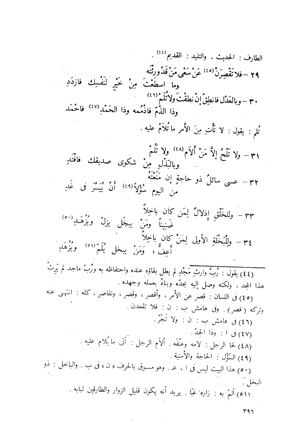 ولا تَلْحِ إلاّ مَنْ أَلامَ ولا تَلُمْ ... وبالبَذْلِ من شَكوَى صَديقِكَ فافتَدِ
