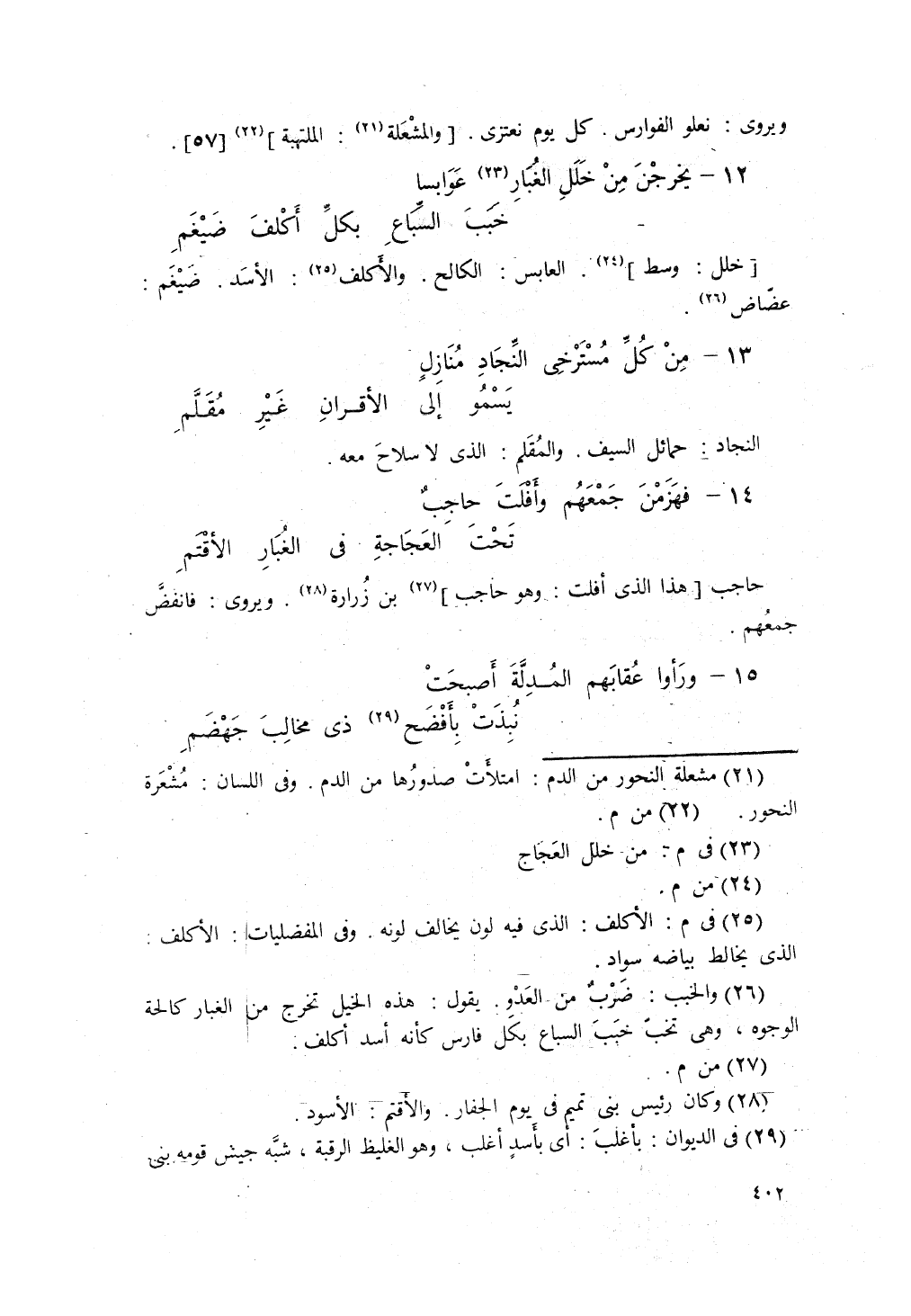 يَخْرُجْنَ مِنْ خَلَلِ العَجَاجِ عَوابِساً ... خَبَبَ السِّبَاعِ بِكُلّ أَكْلَفَ ضَيْغَمِ