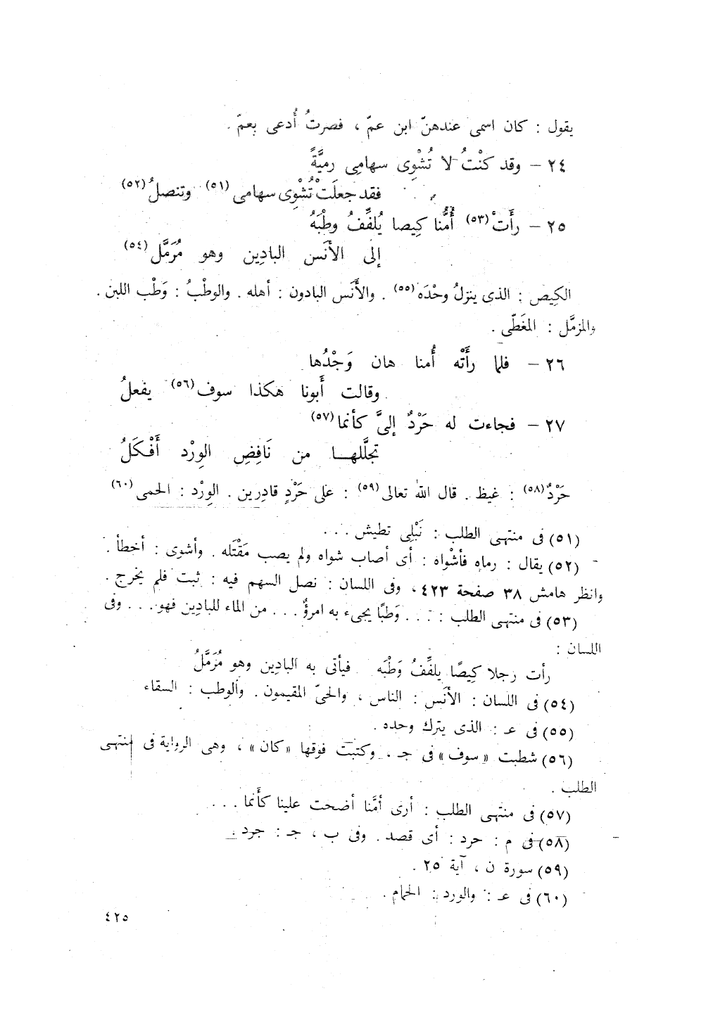 رَأَتْ أُمُّنا كَيصاً يُلَفِّفُ وَطْبَهُ ... إلى الأُنُسِ البادِينَ، وَهُوَ مُزَمَّلُ