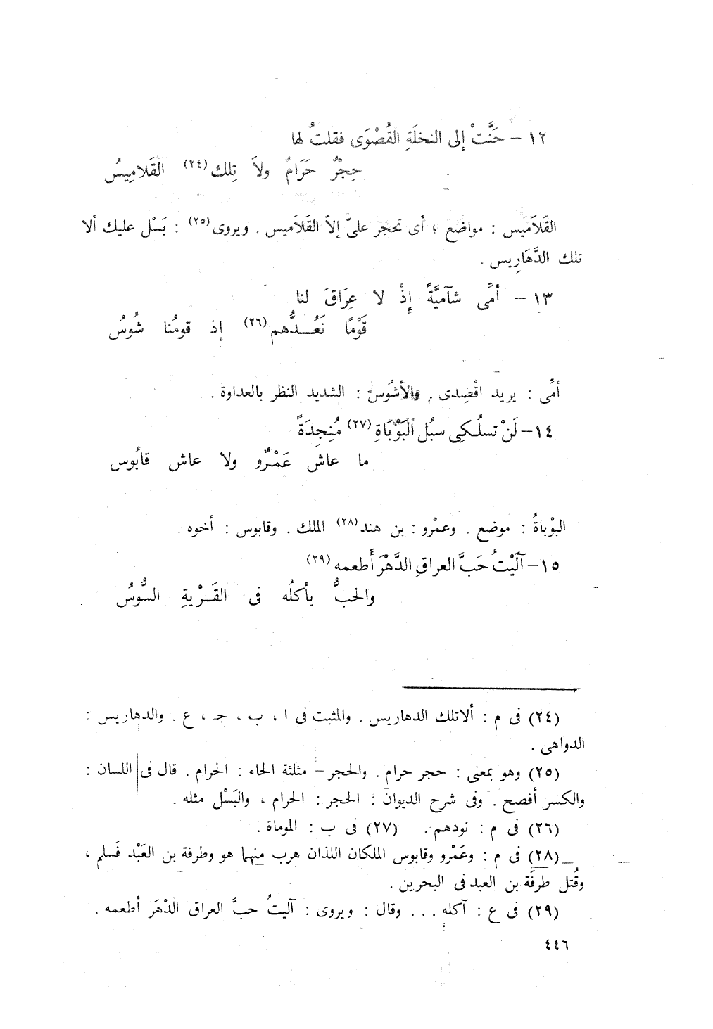 حَنَّتْ إلى النّخْلَةِ القُصْوَى، فقُلْتُ لها: حُجْرٌ، حَرَامٌ أَلاَ تِلْكَ الدّهَارِيسُ