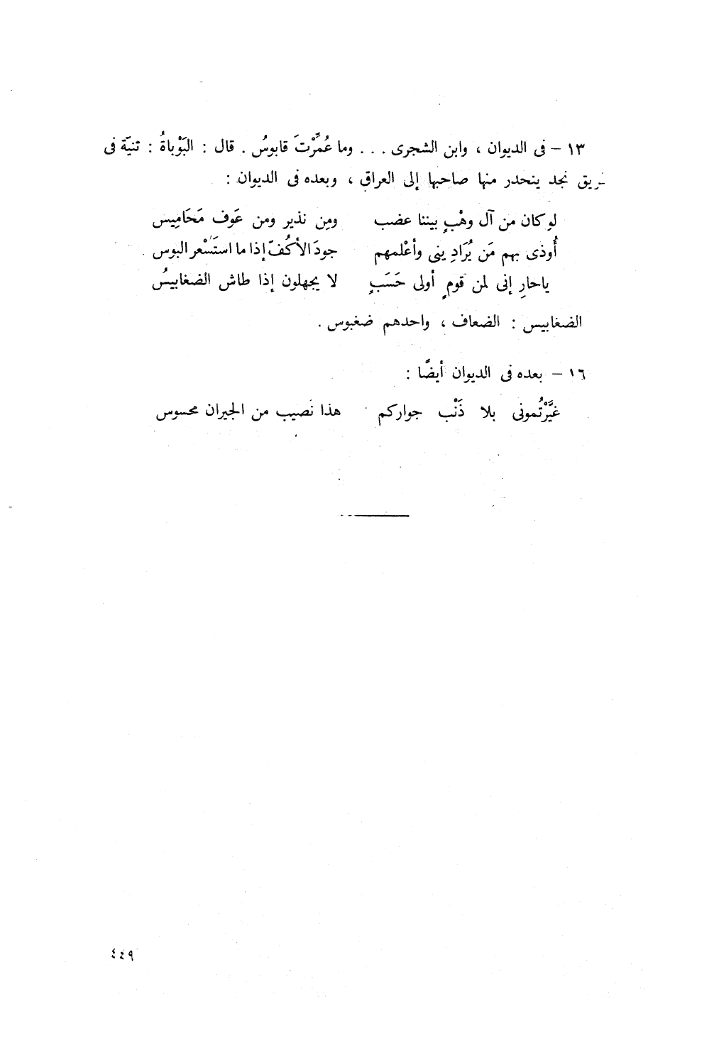 يا حارِ! إنّي لَمِنْ قَوْمٍ أَولي حَسَبٍ ... لا يَجْهَلُونَ، إذا طاشَ الضّغابِيسُ