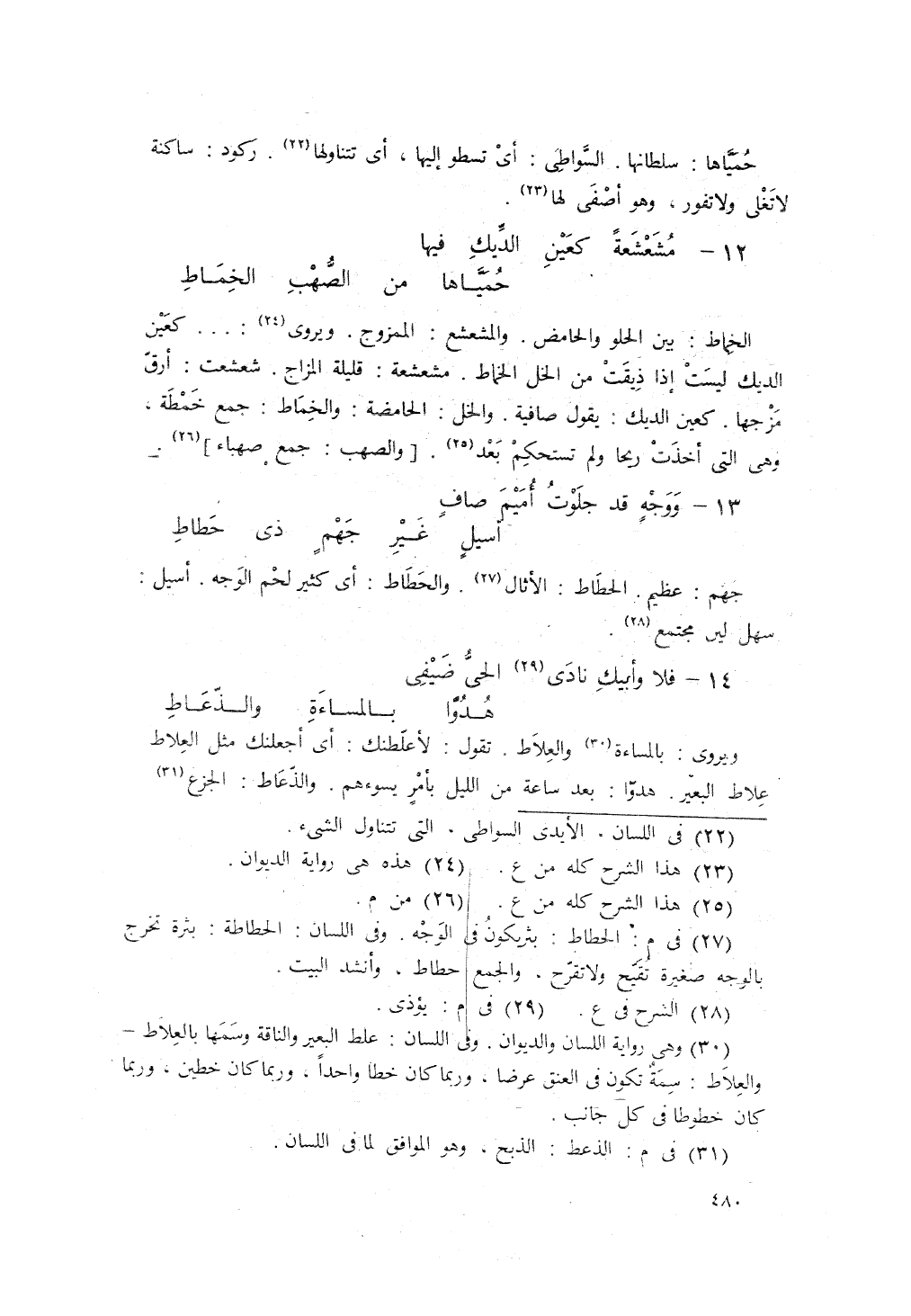 مُشَعْشَعَةٌ كَعَيْنِ الدِّيكِ، فِيهَا ... حُمَيّاهَا مِنَ الصُّهُبِ الخِمَاطِ