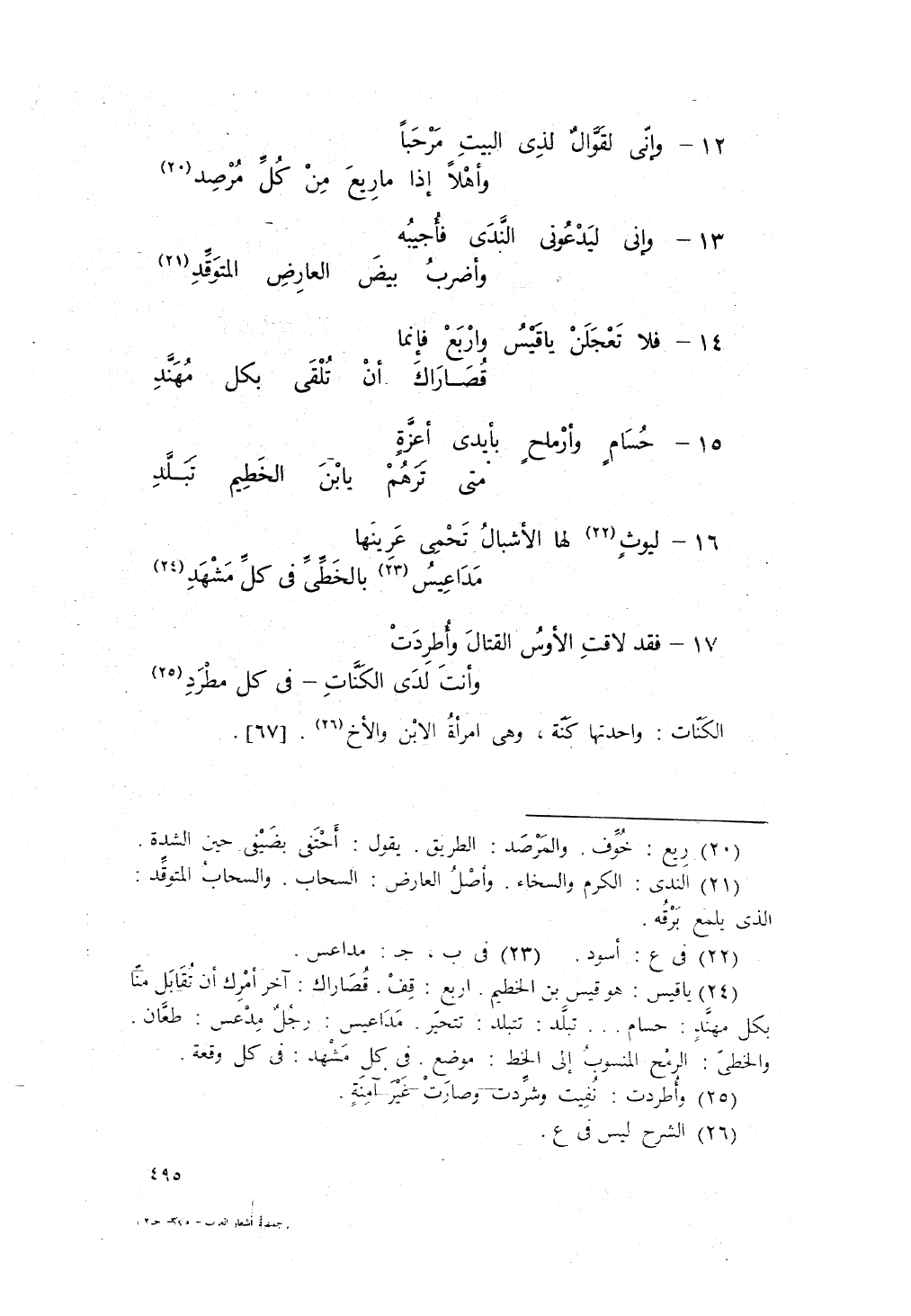 فَلاَ تَعْجَلَنْ يَا قَيْسُ، وارْبَعْ، فَإنّما ... قُصاراكَ أَنْ تُلْقَى بِكُلِّ مُهَنّدِ