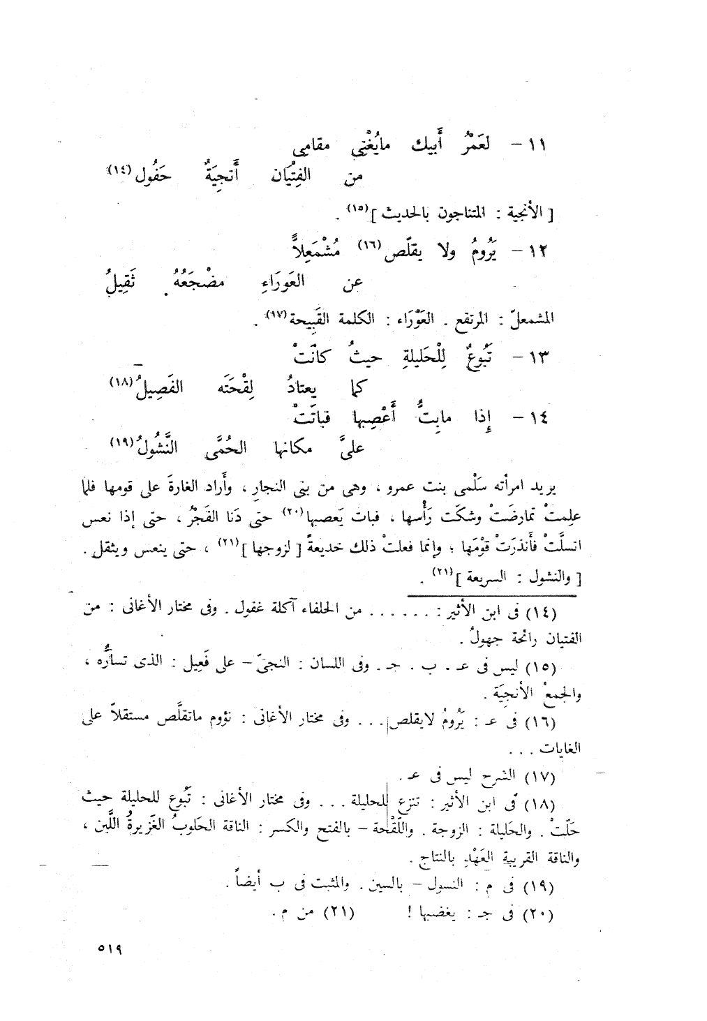 لَعَمْرُ أَبِيكَ مَا يُغْنِي مُقَامي ... مِنَ الفِتْيَانِ أَنْجِيَةٌ حُفُولُ