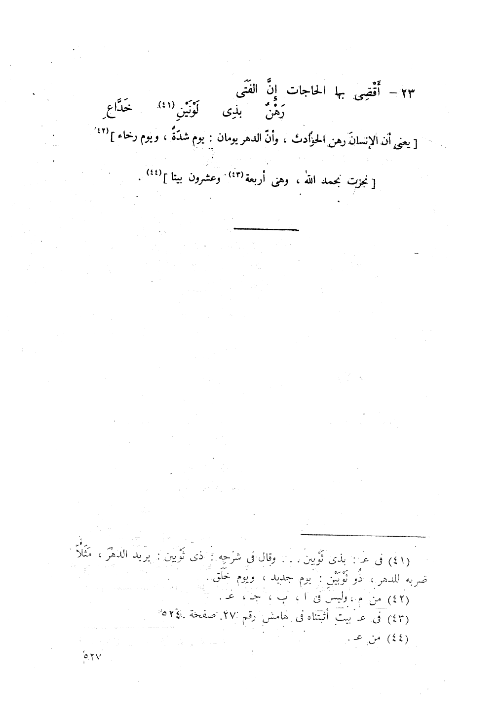 أَقْضِي بِهَا الحاجاتِ، إنّ الفتى ... رَهْنٌ لِذي لَوْنَيْنِ خَدّاعِ